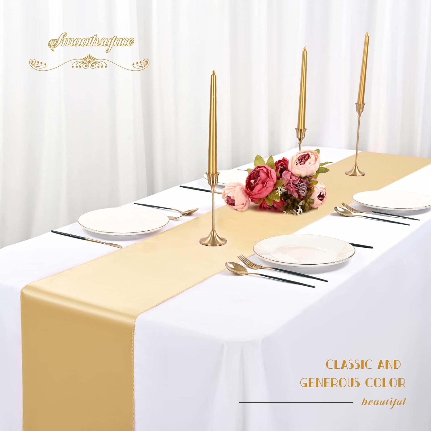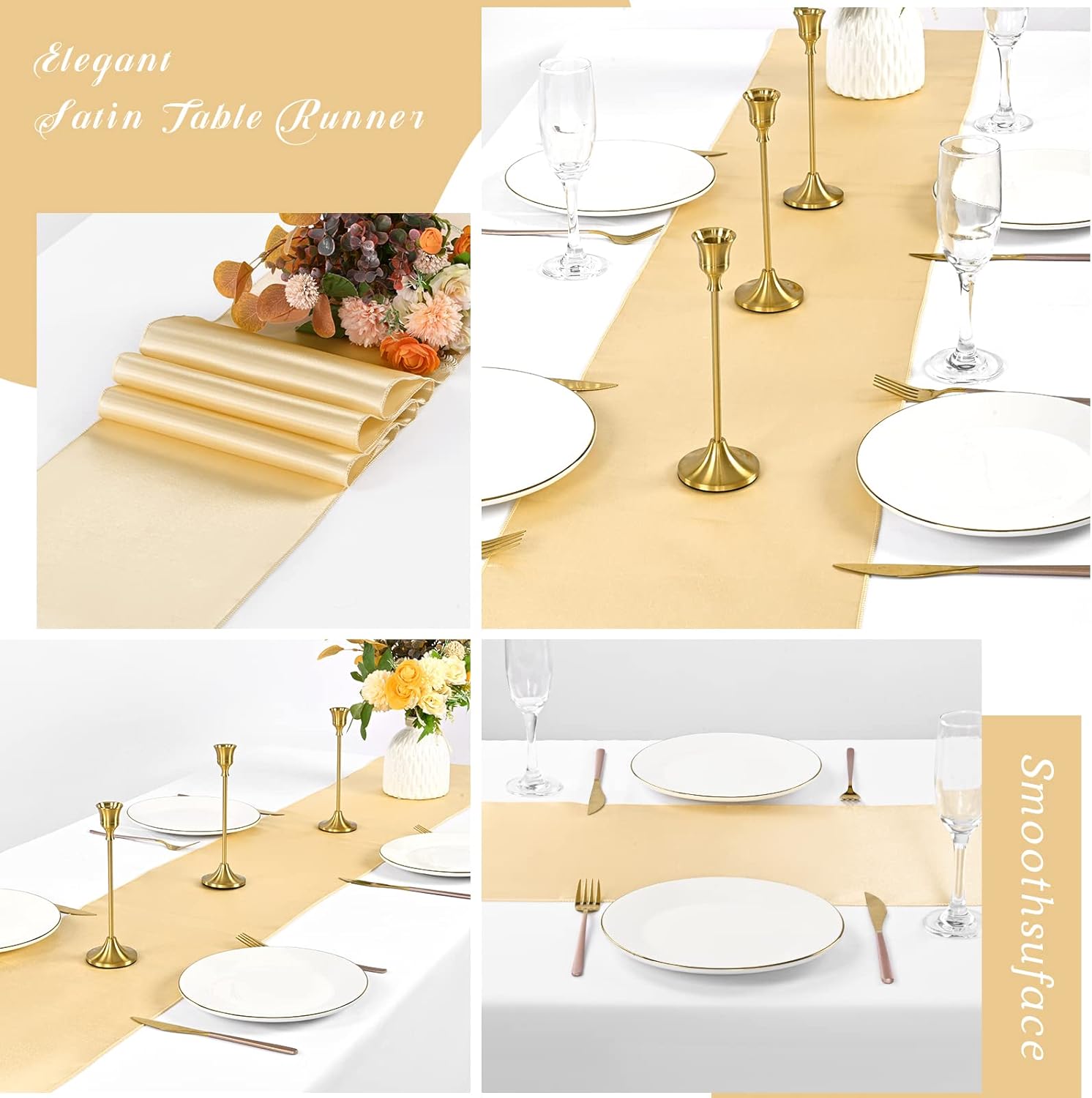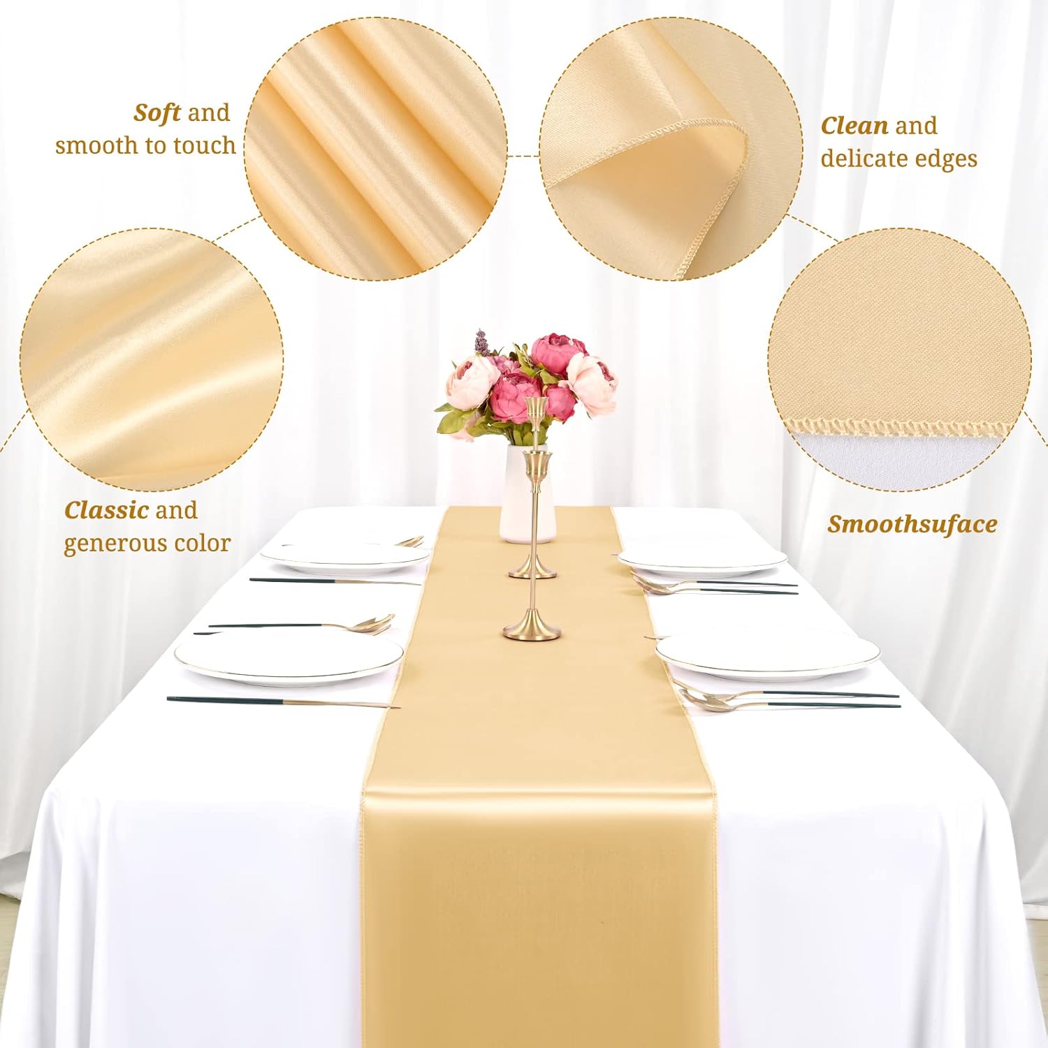 - đăSet includesă12Pack champagne gold satin table runner measures 12" x 108" in size, appropriate for a table that can seat 8-10 people. This satin table runner can fit a 6ft/8ft rectangular table or round table well.This satin table runner is great for event table decorations.Our satin table runner make your dining table more dazzling and outstanding.Purchase our 12piece satin table runner and save even more.