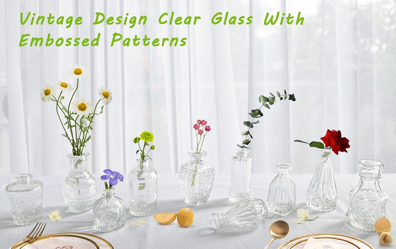 - 🌷VARIETY OF SHAPE: The surface of each glass vase is beautifully etched with a pattern.Each of these unique mini rustic vase comes with a different design, size, and shape. You can use them alone as a beautiful decorative piece, or you can add green plants and artificial flowers to create an atmosphere.