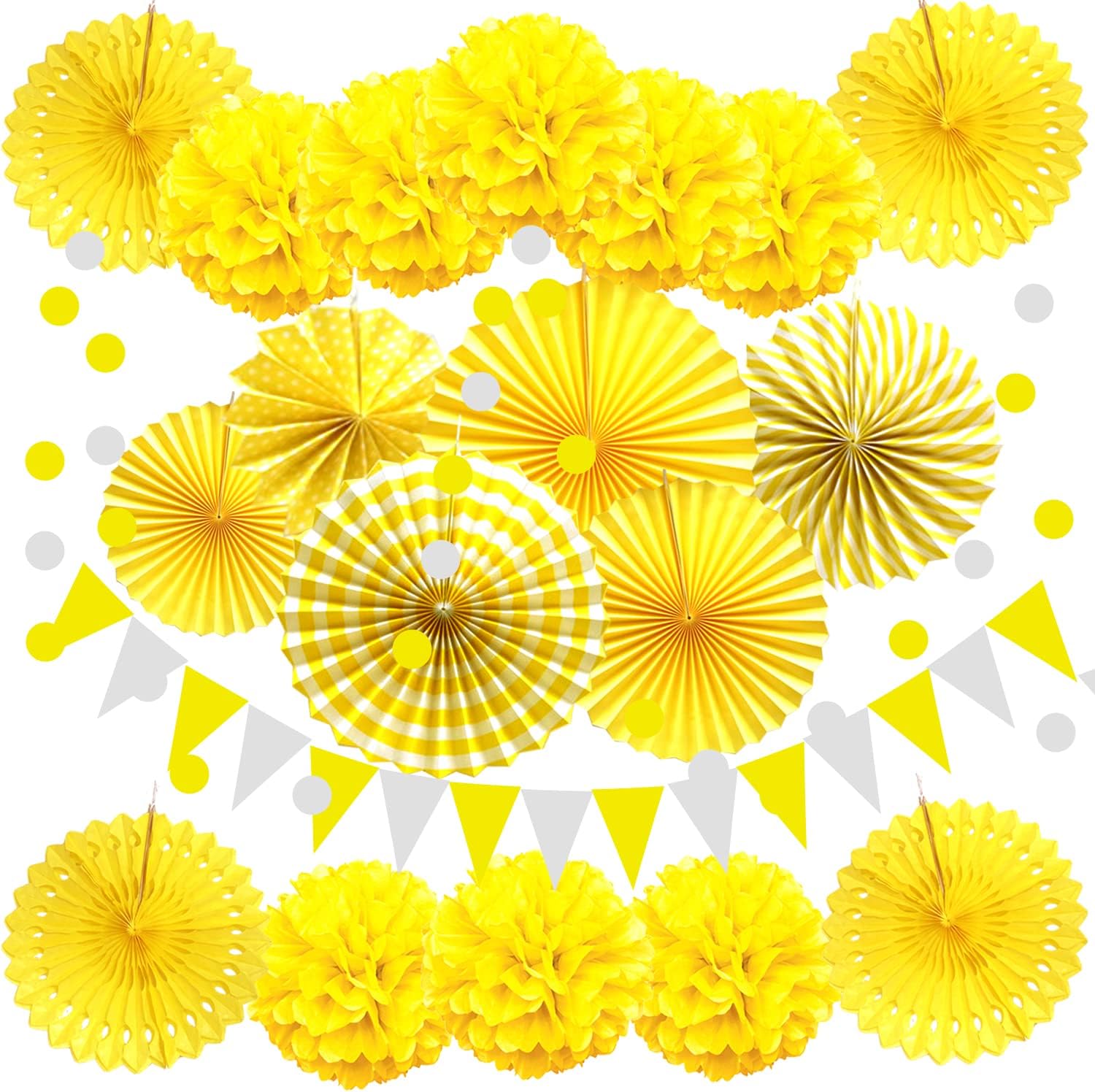 - Includes: 1 x 6.5ft Triangular pennants, 8 x 10inch/25cm Paper pompoms, 6 x 10inch/25cm Paper fans, 4 x Paper hollow fans, 2 x 6.5ft Circle Paper Garland. ( Color: Yellow and White)