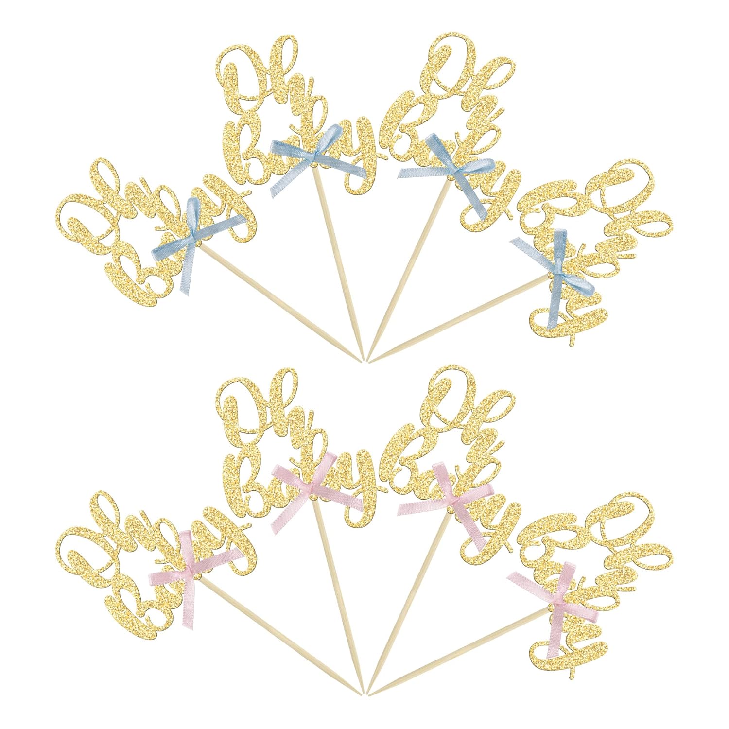 - ๐๐These Gold Oh Baby with Bowknot Cupcake Toppers are so cute and good for oh baby theme party, gender reveal party, baby shower theme party, kids birthday party cupcake decorations. They can make your cupcake more attractive and bring the fun to your party. You can also apply them for ice cream, fruits, cookies and other desserts.