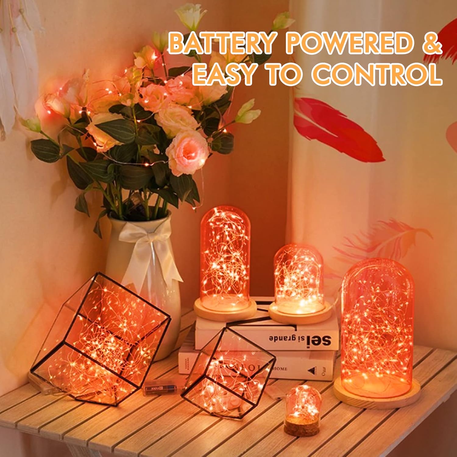 - ✨【Safe to Use & Waterproof & Energy Saving】The LED fairy light is powered by a 3V low voltage battery and insulated silver copper wire, it has low energy consumption and will not overheat. This fairy light still remains cool and safe to touch after a long time use. The fairy moon string lights waterproof rating is IP44 (the battery pack is not waterproof), and can be used indoors or outdoors