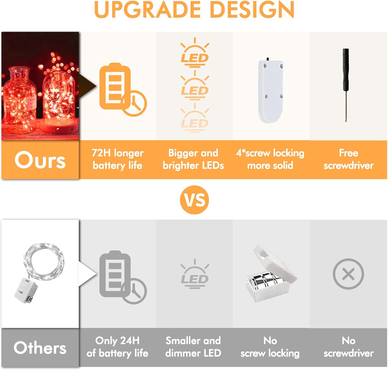 - ✨ 【Long battery life】The battery-powered fairy light battery case contains 2*CR2032 battery. The battery life is up to 72 hours, which is longer than the 24 hours of other fairy string lights. We have a screwdriver for every box of fairy lamps. When the light of your LED fairy lights becomes weak, you only need to buy new batterys and change it with a screwdriver to use it again. The operation is easy and simple