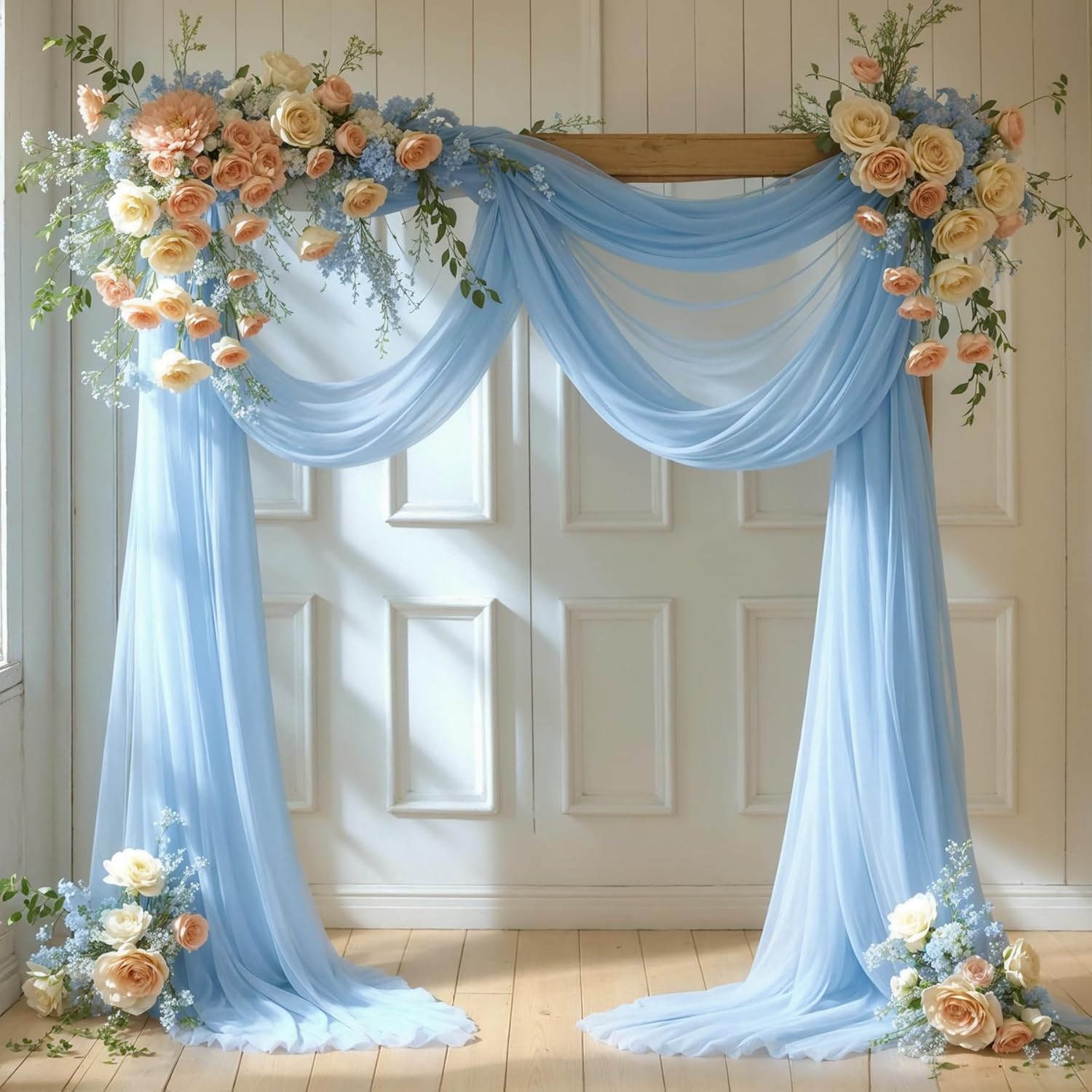 - What You Get: Including 2 panels baby blue chiffon wedding arch drapes, each panel is 29" wide by 6 Yards (216 inches) long. Voile sheer chiffon draping fabric are good choice to decorate your wedding arch arbor.