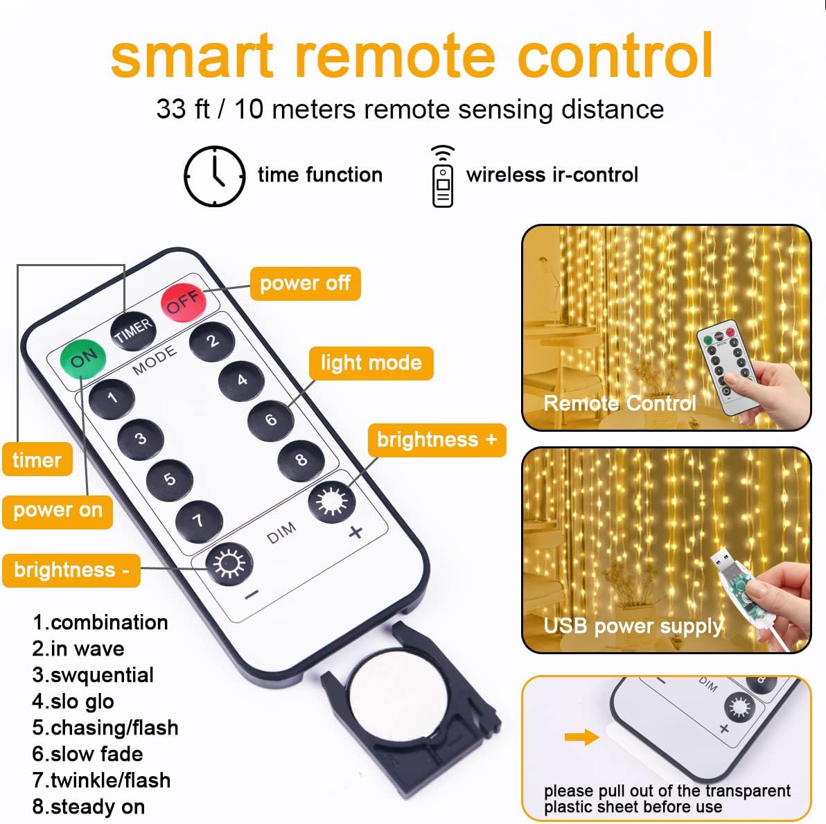 - 🌟【High quality 300 LED Curtain Lights】Curtain Lights are 9.8ft.x9.8ft, these fairy string curtains lights are made of copper wire, and contain 300 pcs super bright LEDs. It is completely sealed, very safe, soft, and firm, The Curtain Light can be cut freely without affecting the rest light, so you can DIY any decoration you like.