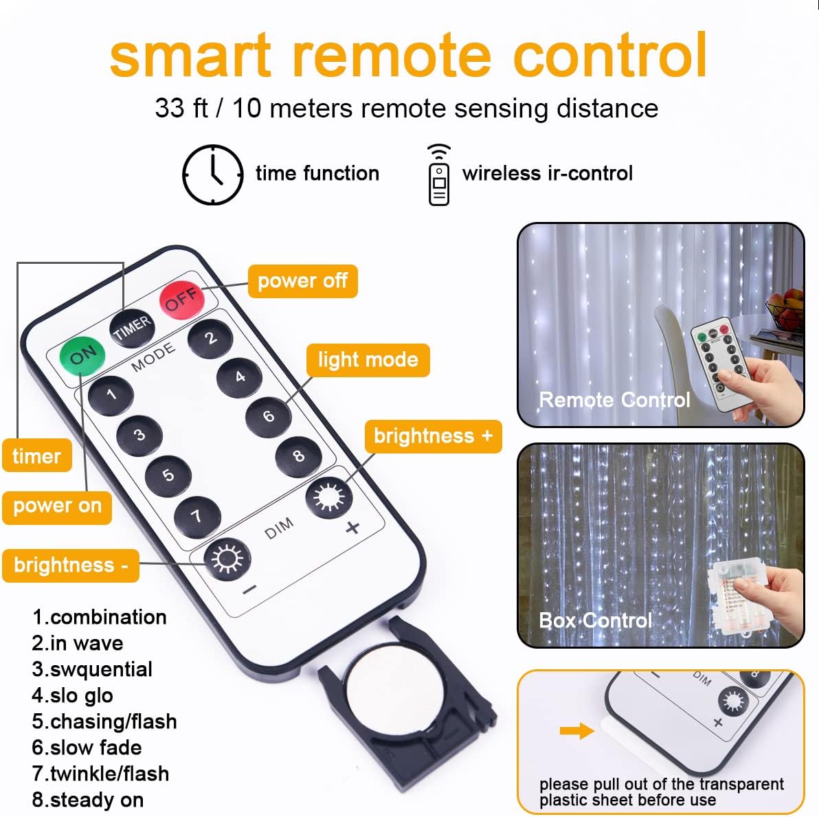 - 🌟【High quality 300 LED Curtain Lights】Curtain Lights are 9.8ft.x9.8ft, these fairy string curtains lights are made of copper wire, and contain 300 pcs super bright LEDs. It is completely sealed, very safe, soft, and firm, The Curtain Light can be cut freely without affecting the rest light, so you can DIY any decoration you like.