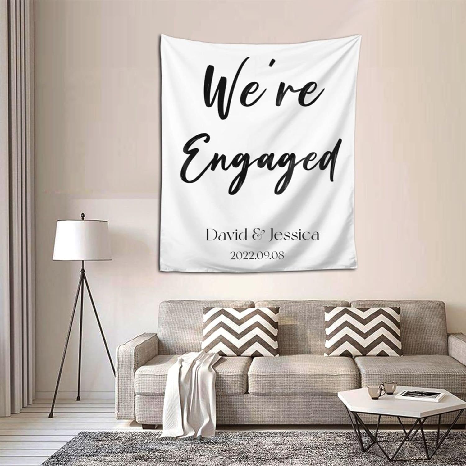 We're Engaged Backdrop, Custom Tapestry with Names and Date, Personalized Calligraphy Wedding Banner for Ceremony, Engagement Backdrop, Rustic Wedding Sign, Reception Backdrop, Engagement Party Decor