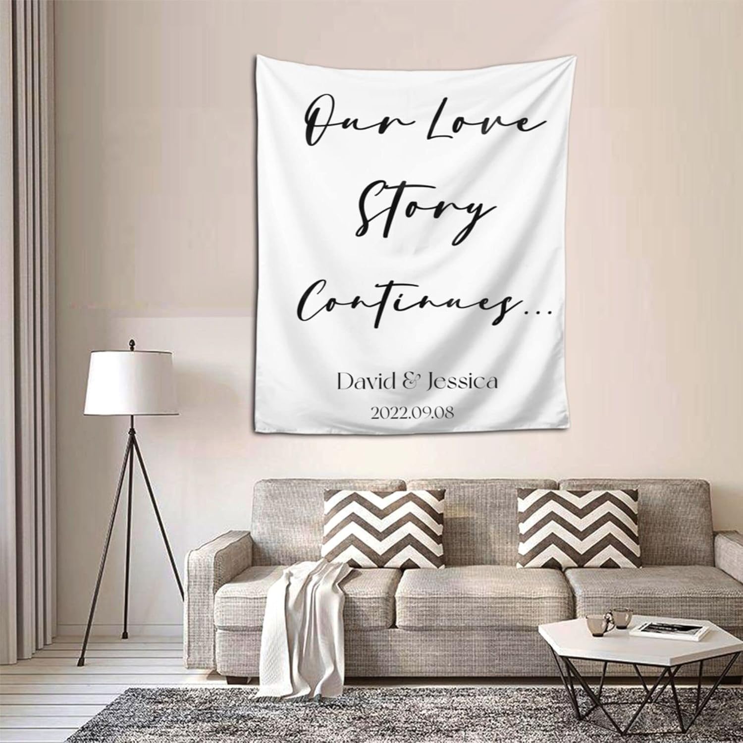 - Add Your Own Design: Customized your own wedding quote banner with your names and your big date. You can change the background and the text's color by yourself. Click 'Customize Now' to start your design, then you will get a unique and beautiful tapestry for your big day! Some customers like to change the fonts, if you also need that, you can leave a message or send us the font name or font photo directly, we will try to find the same font or similar ones.