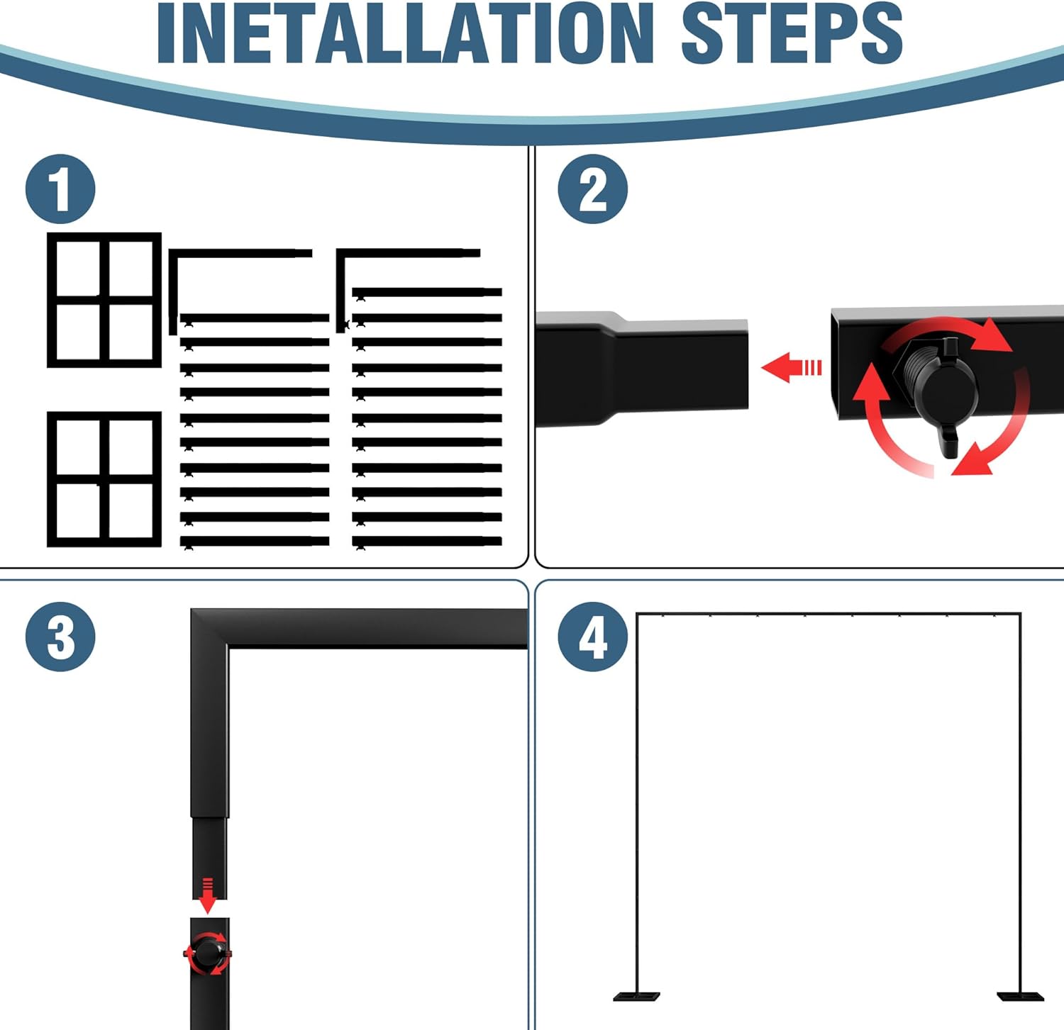 - 【Package Includes】Heavy duty black metal backdrop stand contains L-shaped tube, L-shaped tube with a screw, Short straight tube and 2pcs Rectangular base. Drape not included. These shiny photo booth square arch backdrop stand with unmatchable class and elegance will add more color and atmosphere of festivity to your party.