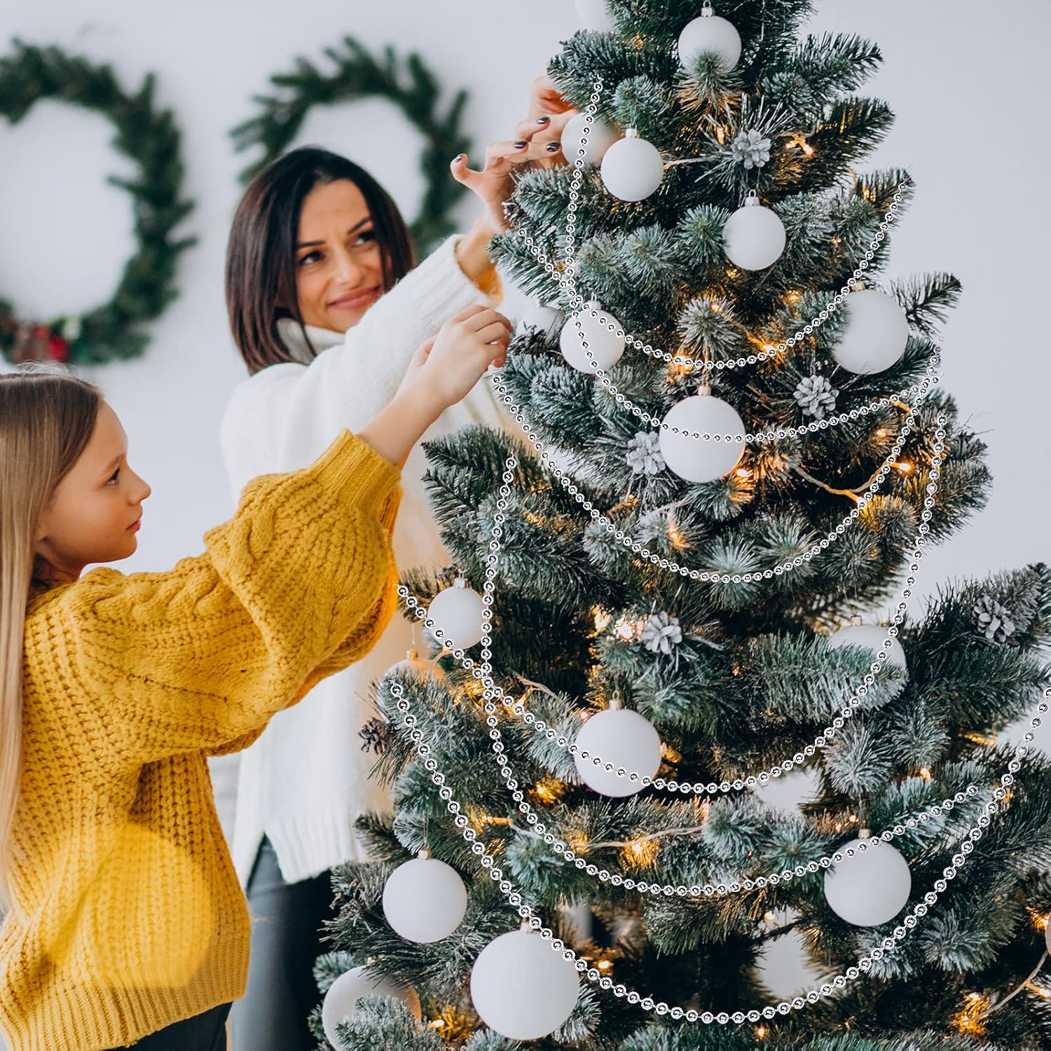 - Faux Pearl Beads Garland: Faux pearl rolls can be cut to the desired length. You can easily adjust the pearl strand length and cut to any length you need for your ornaments or DIY crafts. Each pearl is melted on a sturdy nylon cord, so it won't scatter, and it's easy to handle