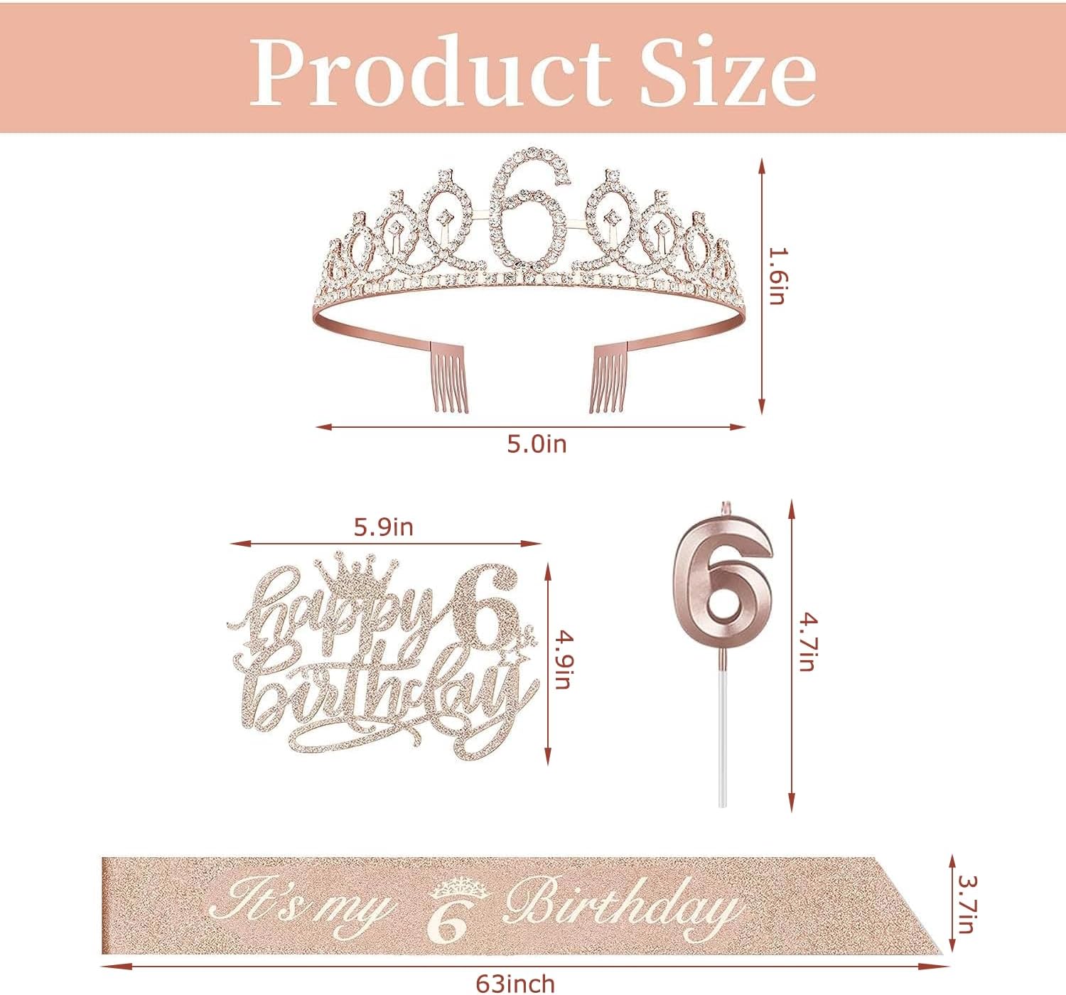- 6th Birthday Decorations: Birthday Sash for Girls *1pc, Birthday Girl Crown*1pc, Happy 6th Birthday Cake Topper *1pc, Numeral 6 Candles *1pc. All be packed in a beautiful gift box ready for good presentation