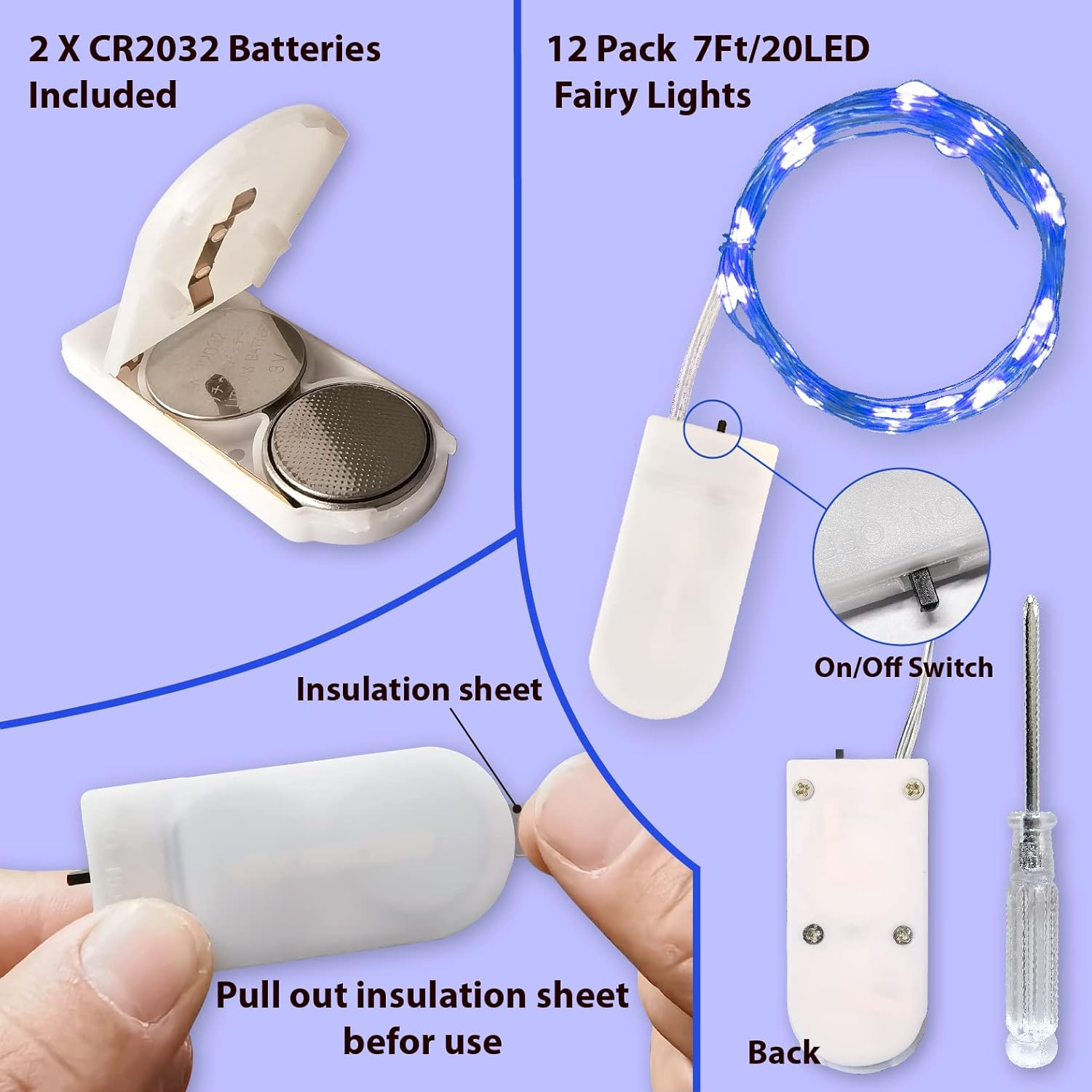 - 【Fantastic Blue Lights】: 12 separate mini fairy lights battery powered, made of 7ft high quality Silver coated copper wire, It’s flexible, strong and durable. Perfect for your crafts project , floral arrangements plants, signs, furniture glass jars, vases, wine bottles or other decorations.