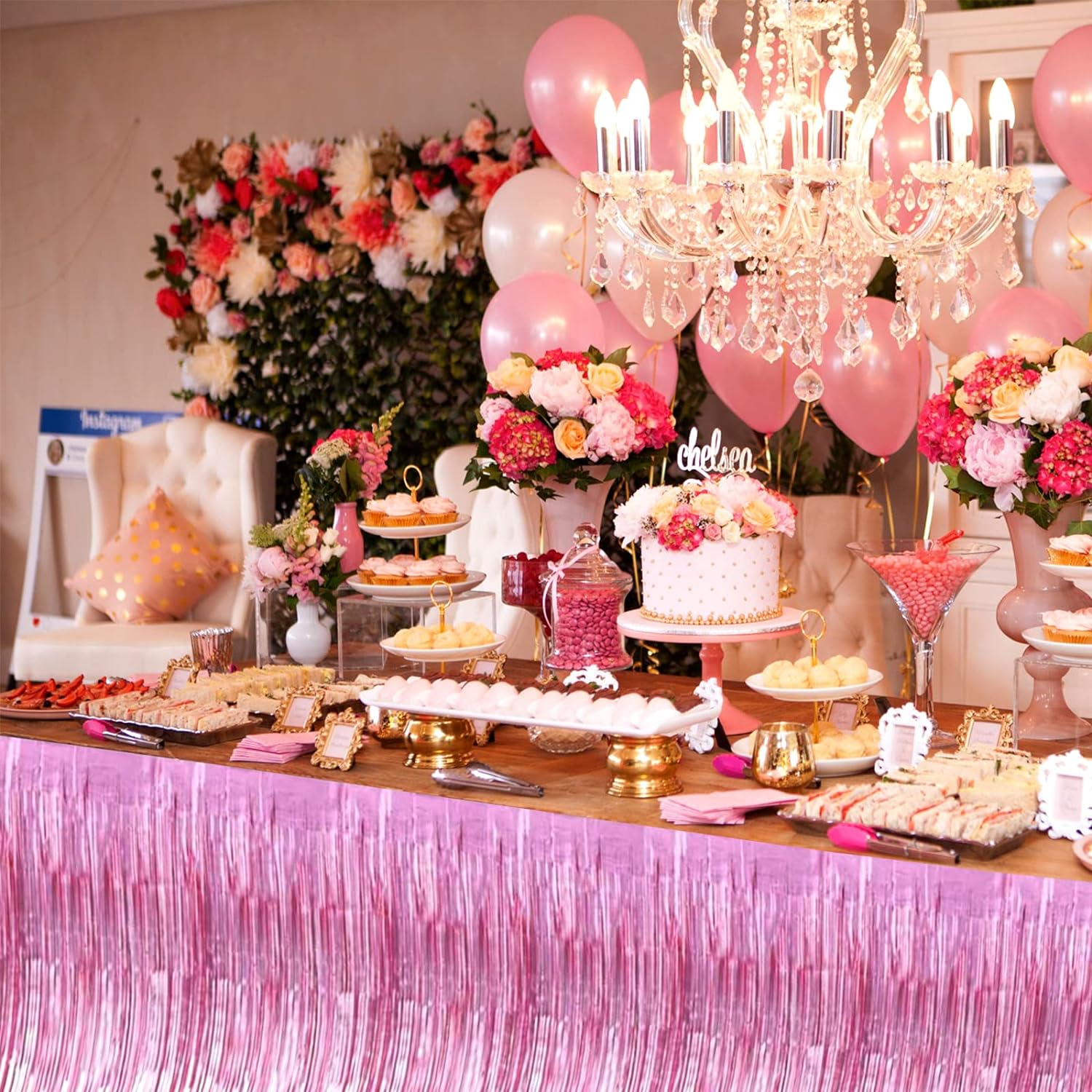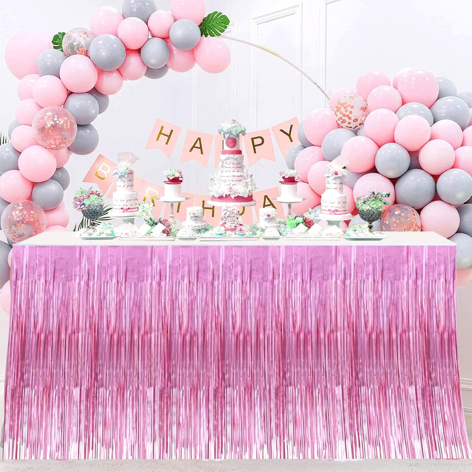 4 Pack 29x108 Inch Valentine's Day Metallic Foil Fringe Tinsel Table Skirts for Rectangle Tables Streamer Curtains Backdrop for Wedding, Birthday, Parade Floats Mardi Gras Party Decorations(Pink)