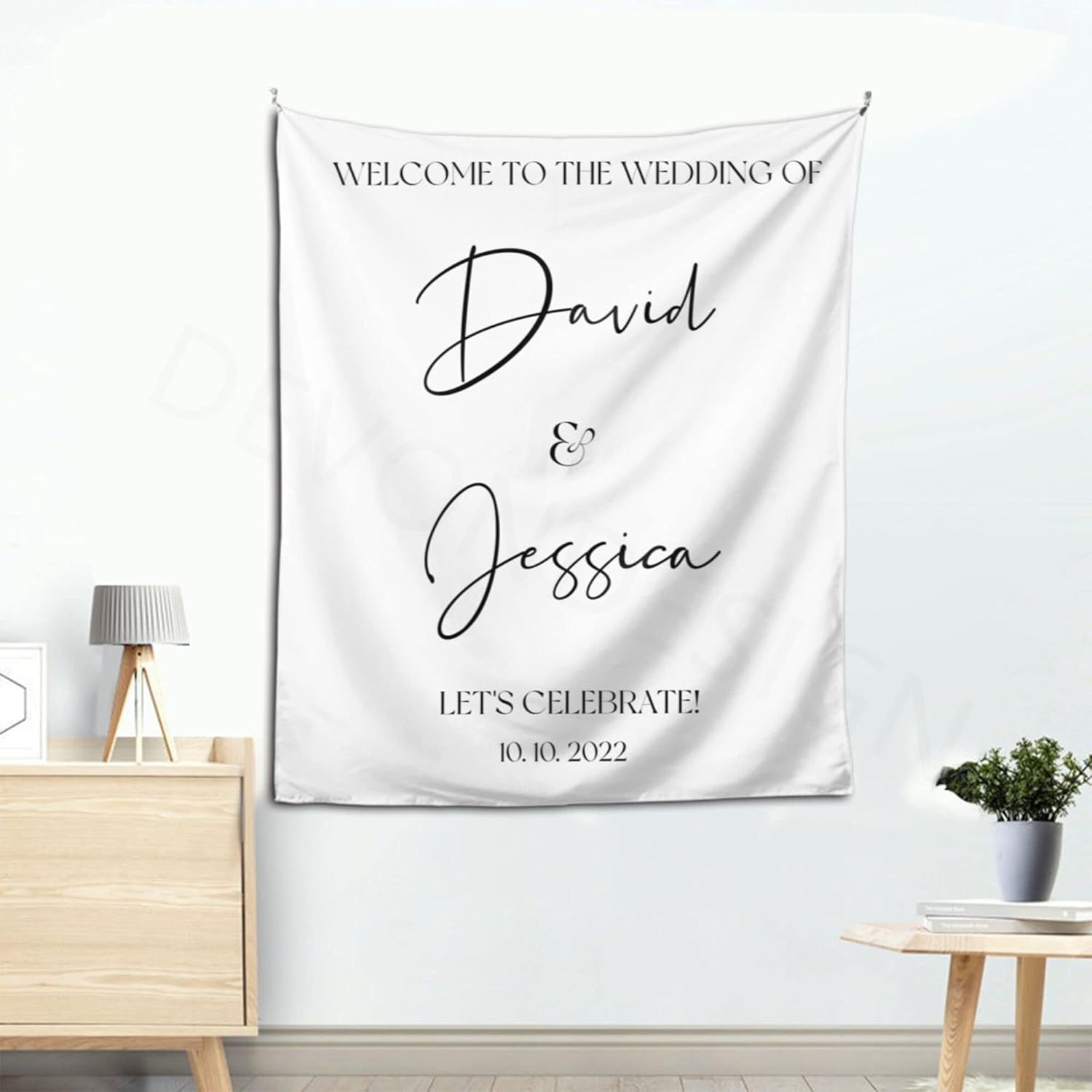 Welcome to Our Wedding Backdrop, Custom Tapestry with Names and Date, Rustic Sign, Personalized Calligraphy Banner for Ceremony, Arch, Reception Let's Celebrate Decor