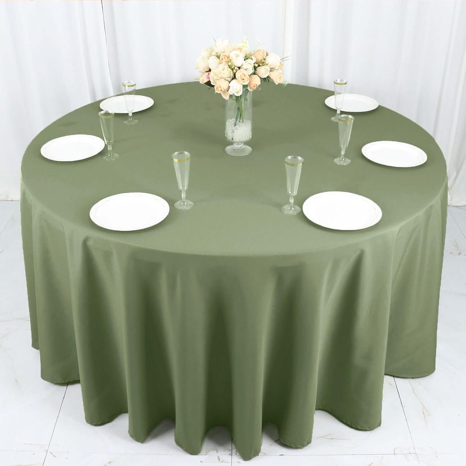 - Quantity: 1 Round Tablecloth Material: 100% Polyester Color: Eucalyptus Sage Green Size: 120"Dia. Thickness: 130 GSM Stain & Wrinkle Resistant, Machine Washable Hemmed edges for an exquisite look. 1 piece, seamless design Gives floor length hang on standard 5ft (60") tables