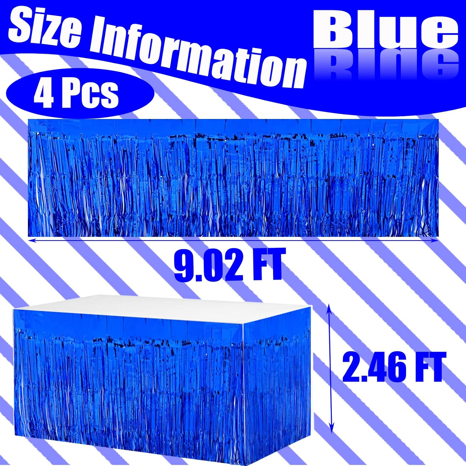 4 Pack 29x108 Inch Metallic Foil Fringe Tinsel Table Skirts for Rectangle Tables Streamer Curtains Backdrop for Wedding, Birthday, Parade Floats, Christmas, Halloween Party Decoration(Blue)