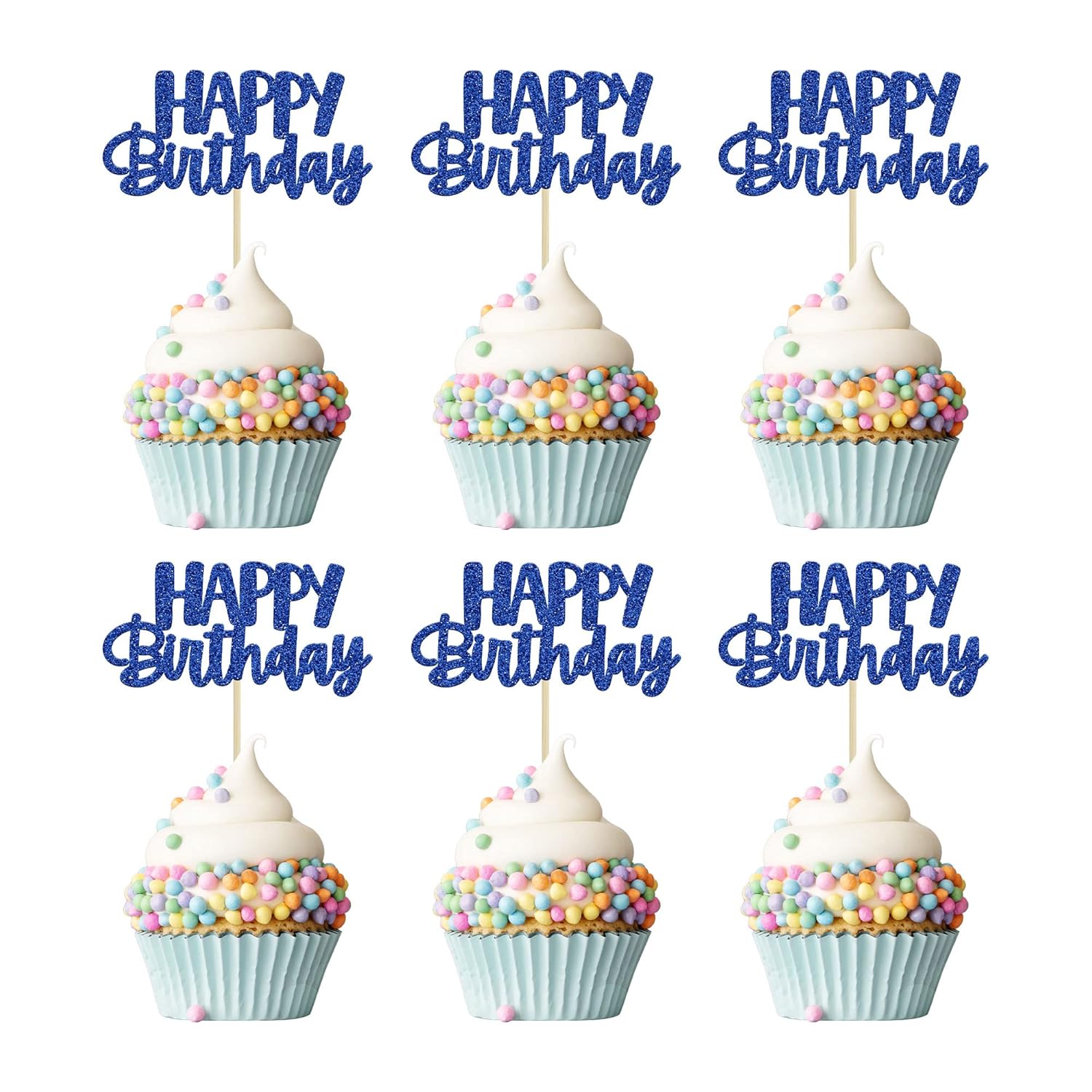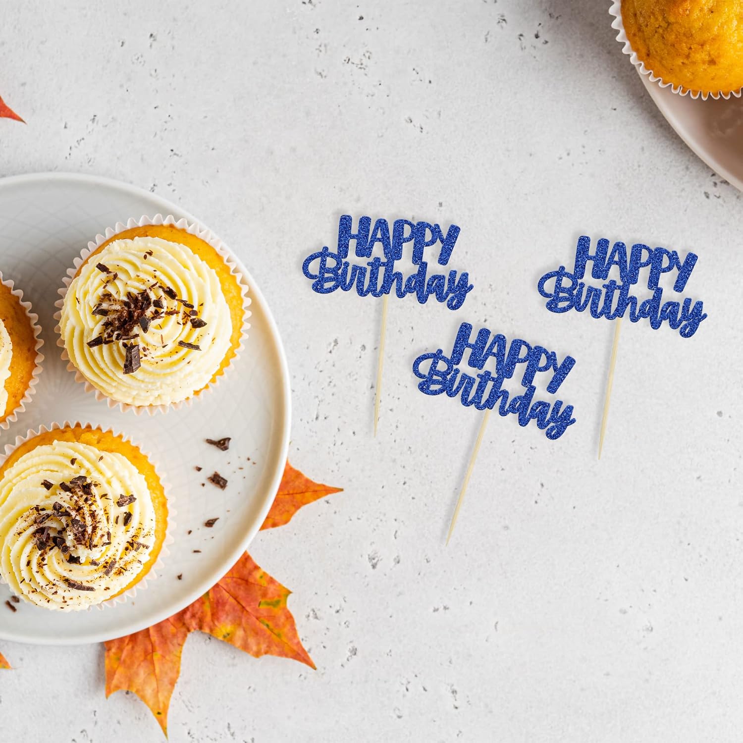 Gyufise 24 Pcs Happy Birthday Cupcake Toppers Glitter Cupcake Food Picks for Celebrating Theme Party Cake Decorations Supplies Deep Blue