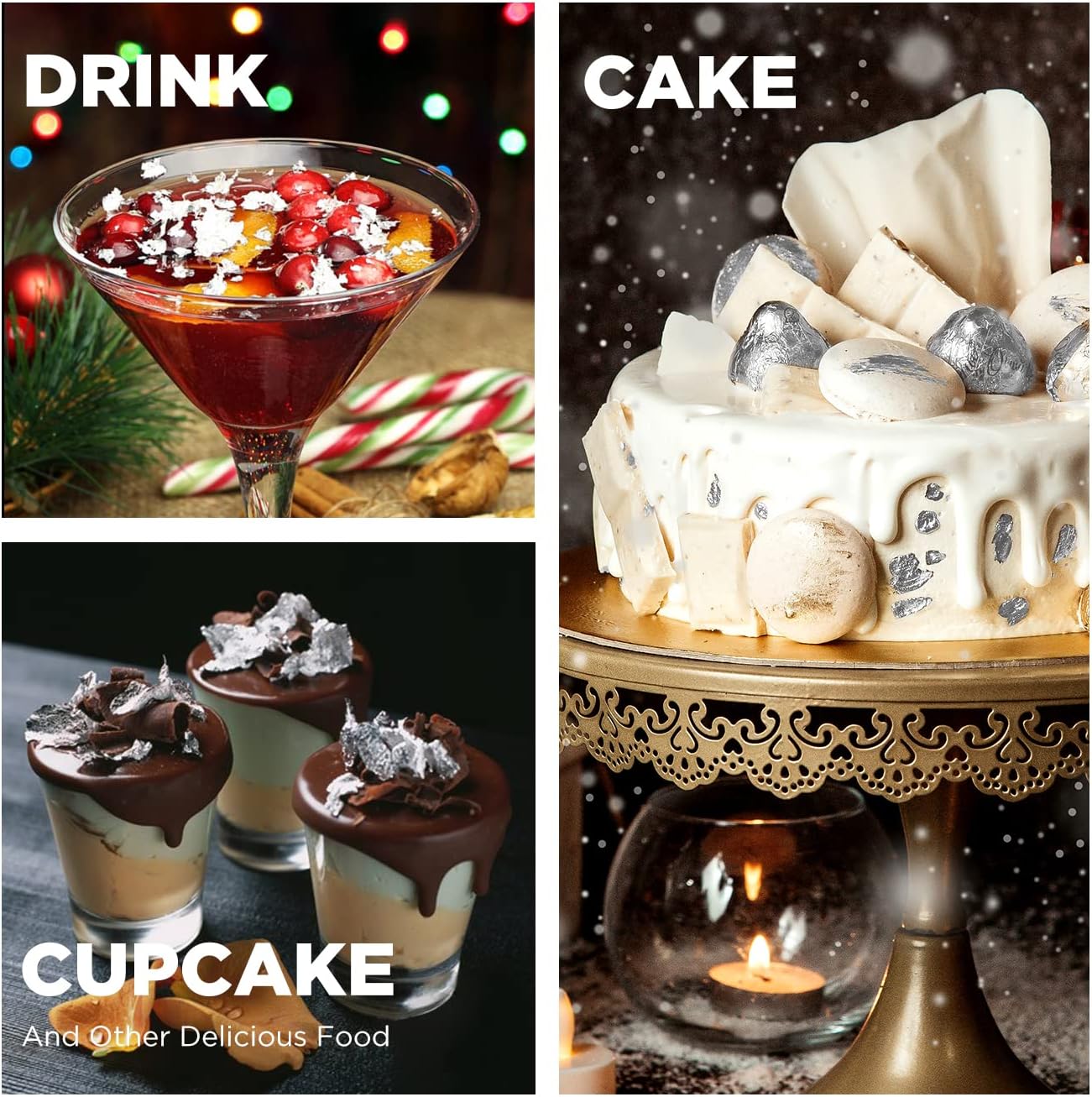- Food & Cake Decoration: Edible silver leaf doesn't change the taste of the food itself. So it's perfect for decorating cakes, bread, cookies, candies, macarons, coffee, cocktails and all kinds of baked foods and drinks. Edible silver leaf makes your food look more luxurious and appetizing.