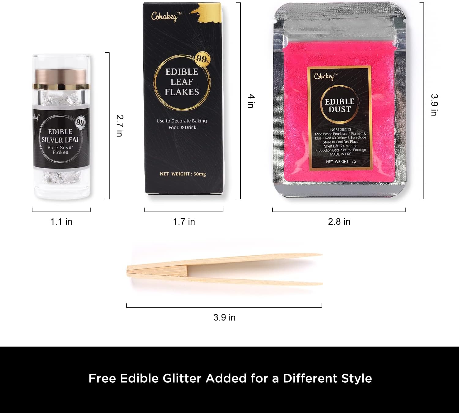 Cobakey Edible Silver Leaf - 50mg Silver Flakes for Cake Decoration (Cupcake, Chocolate, Steak, Drink & Cooking), Edible PureSilver with Edible Glitter & Wooden Tweezers