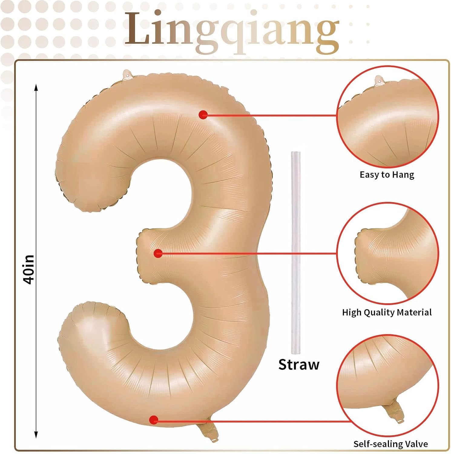 - š Easy to Inflate š - The big light brown number 3 foil balloons have self-sealing valve does not need to be knotted for easy inflation and deflation. It can be inflated with air or helium. When filled with helium, the balloons can float in the air; after filling, press the valve of the digital balloon to seal it. It can be reused. Do not throw away after use!