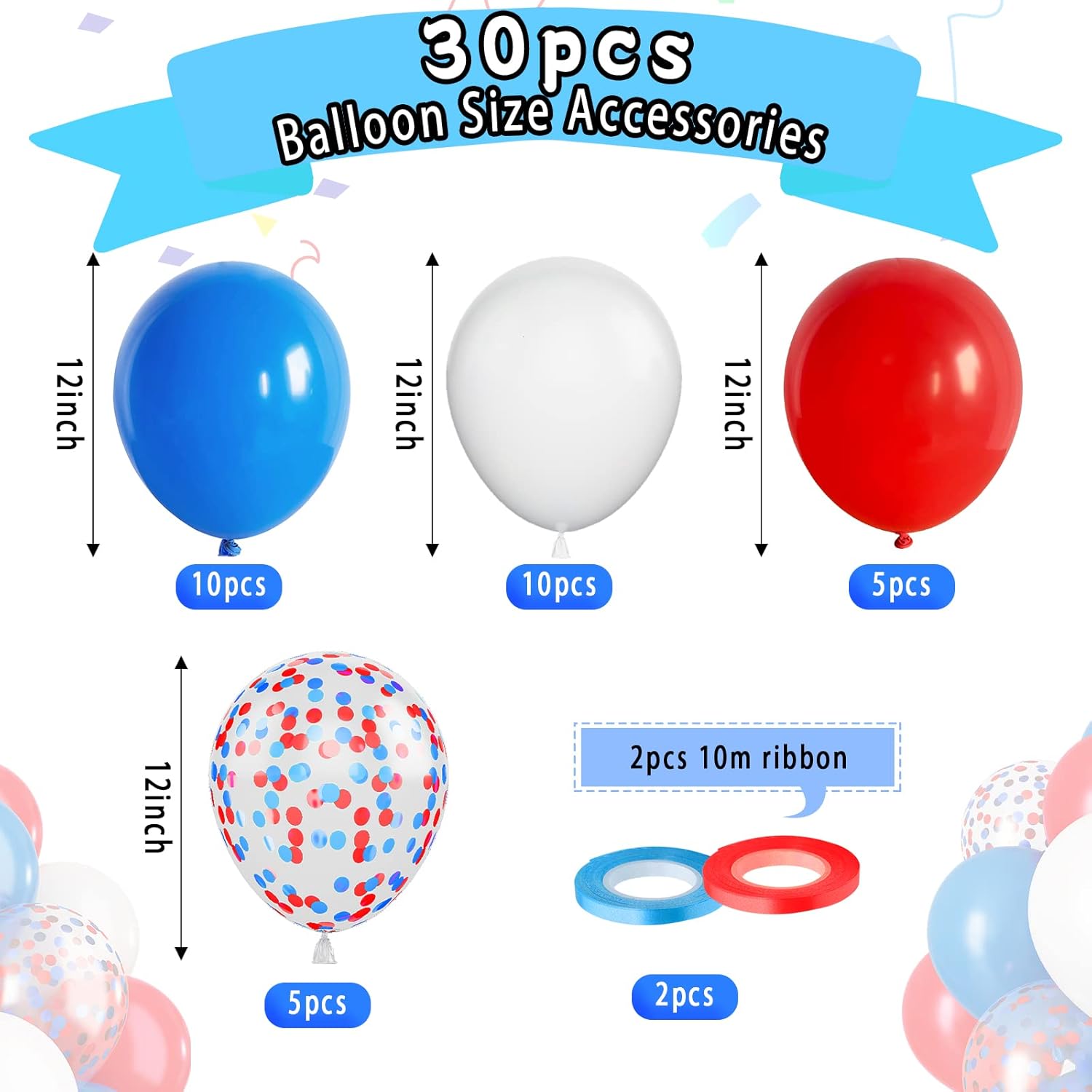 - Mixed Balloons Set: The 12 inch blue and red confetti balloons set includes 10pcs matte navy blue balloons, 7pcs matte red balloons, 8pcs matte white balloons, 5pcs blue and red confetti balloons, 2 roll of ribbon. 32pcs in total. Vibrant colors give you a impressive party and make some unforgettable fond memories.
