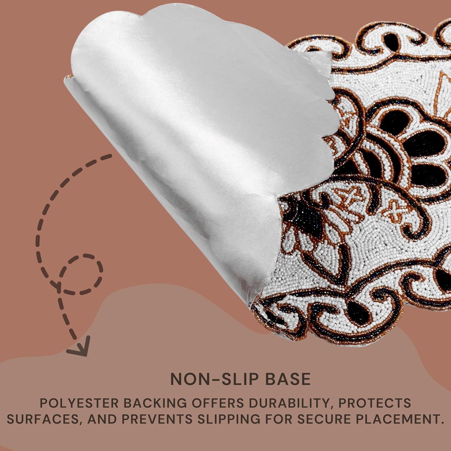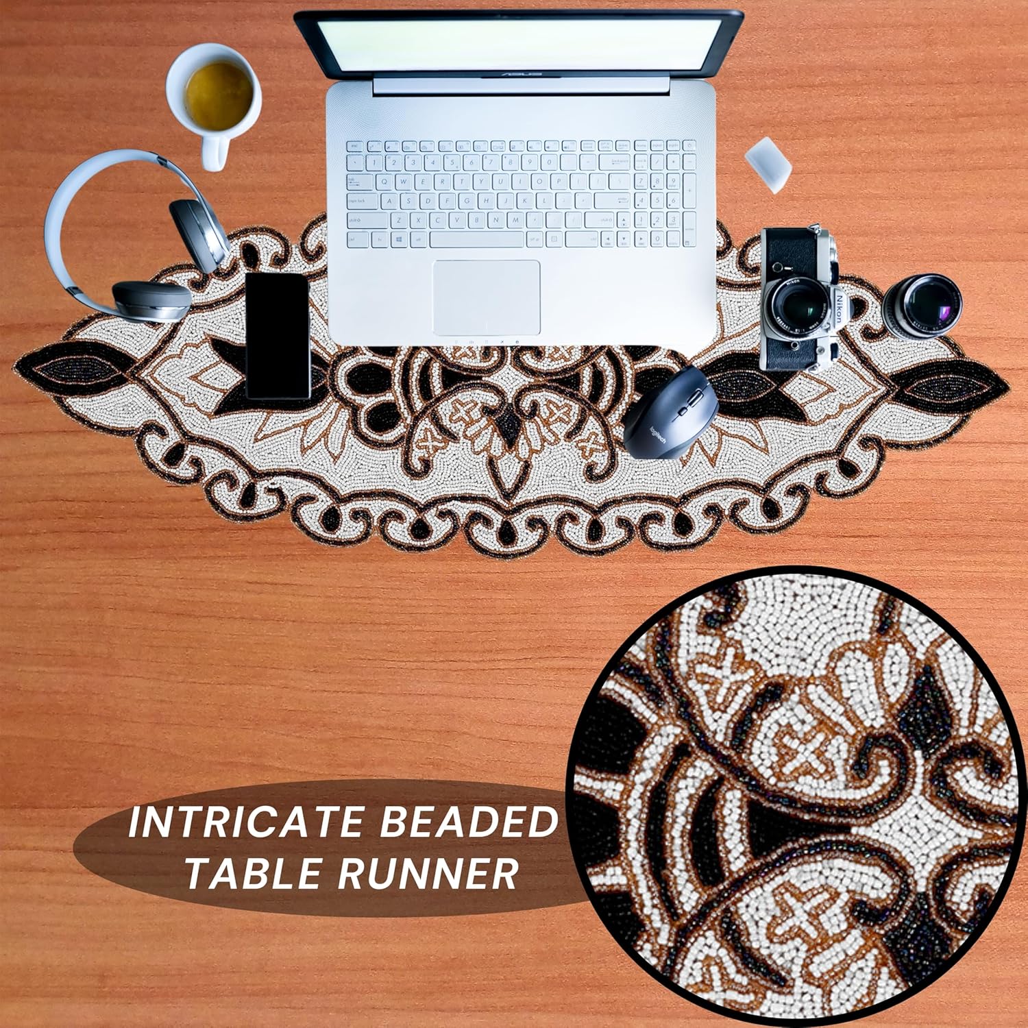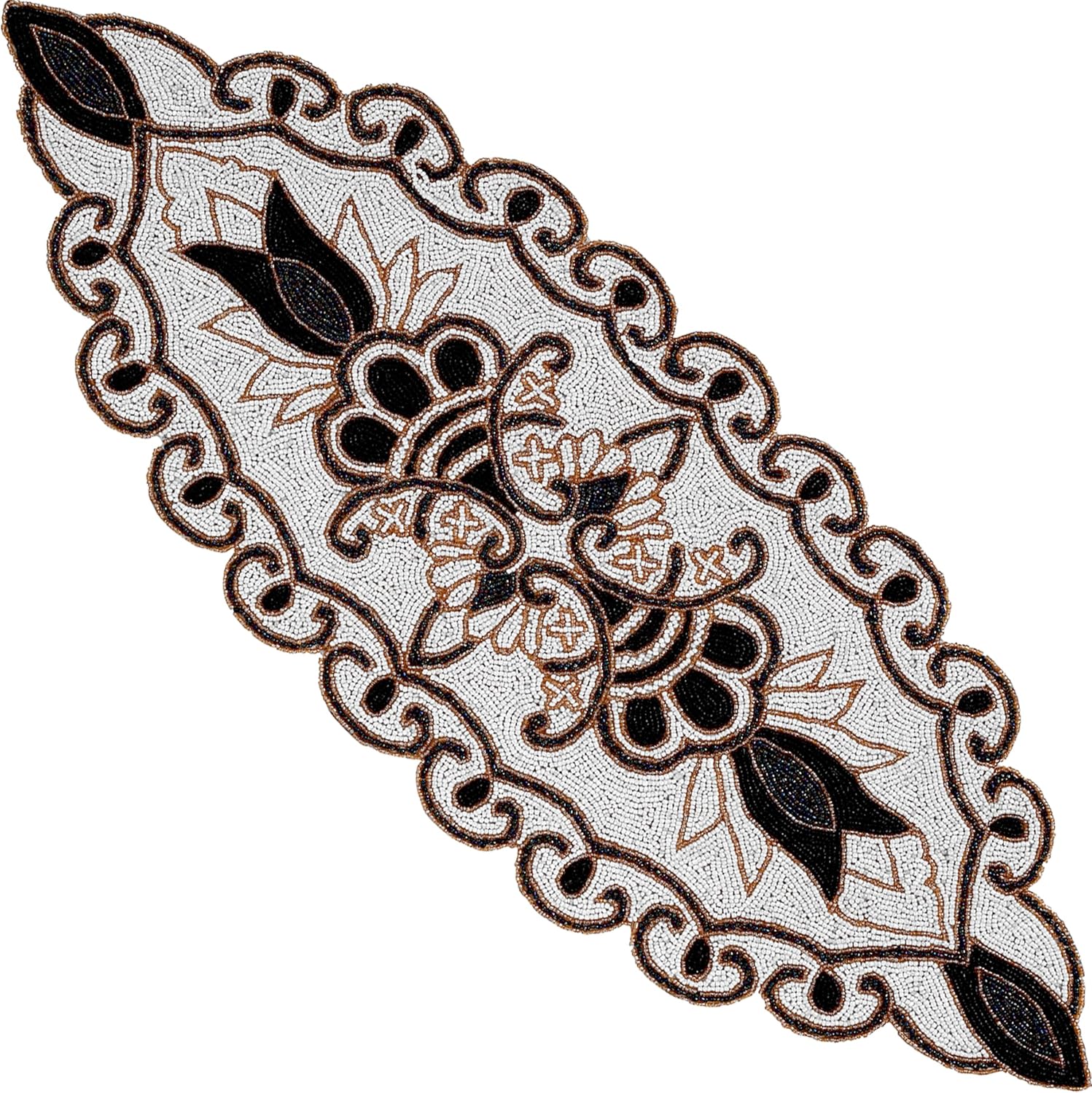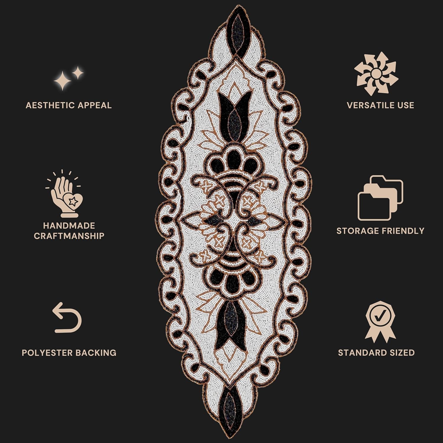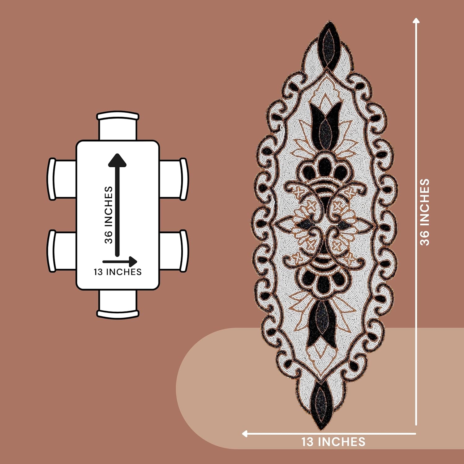 36" Decorative Beaded Table Runner - Handcrafted Floral Design with Durable Polyester Backing for Dining, Coffee Table & Special Occasions (Black White Brown) - CLEENTABLE