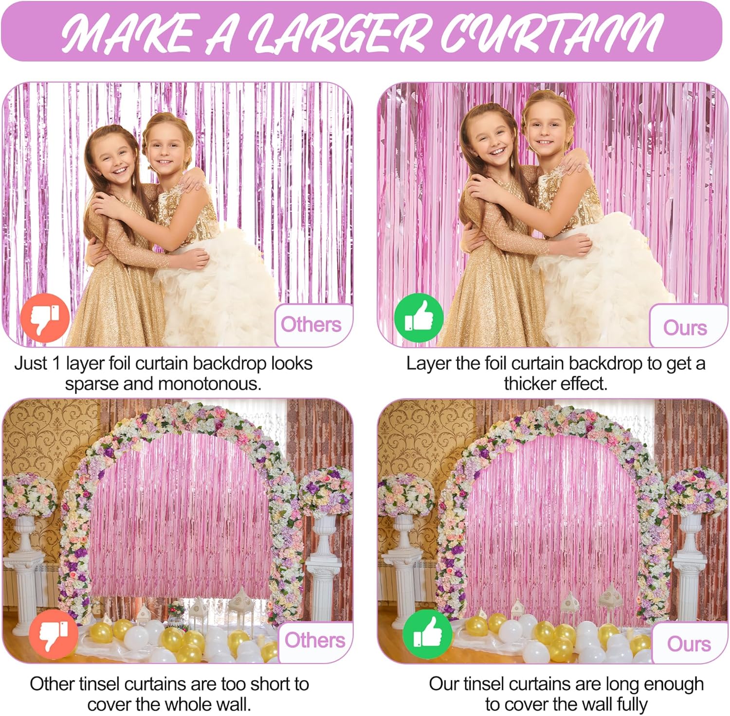 - Easy to Use - The foil curtain backdrop comes with double sided tape on the top, peel plastic strip off and it would be very easy to paste on smooth surfaces such as wall, window, table, door or anywhere you like. You can cut the foil curtain with scissors into the suitable Length, assemble the party streamers side by side to make the pink backdrop larger, or layer the backdrop curtains to get a thicker effect.