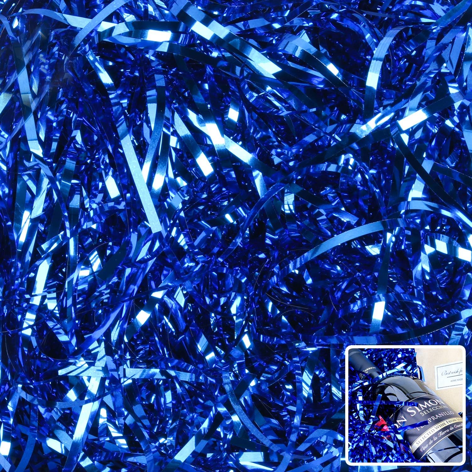 - Package: 150Grams of Crinkle Cut PET Paper Shred Filler in Royal Blue Color