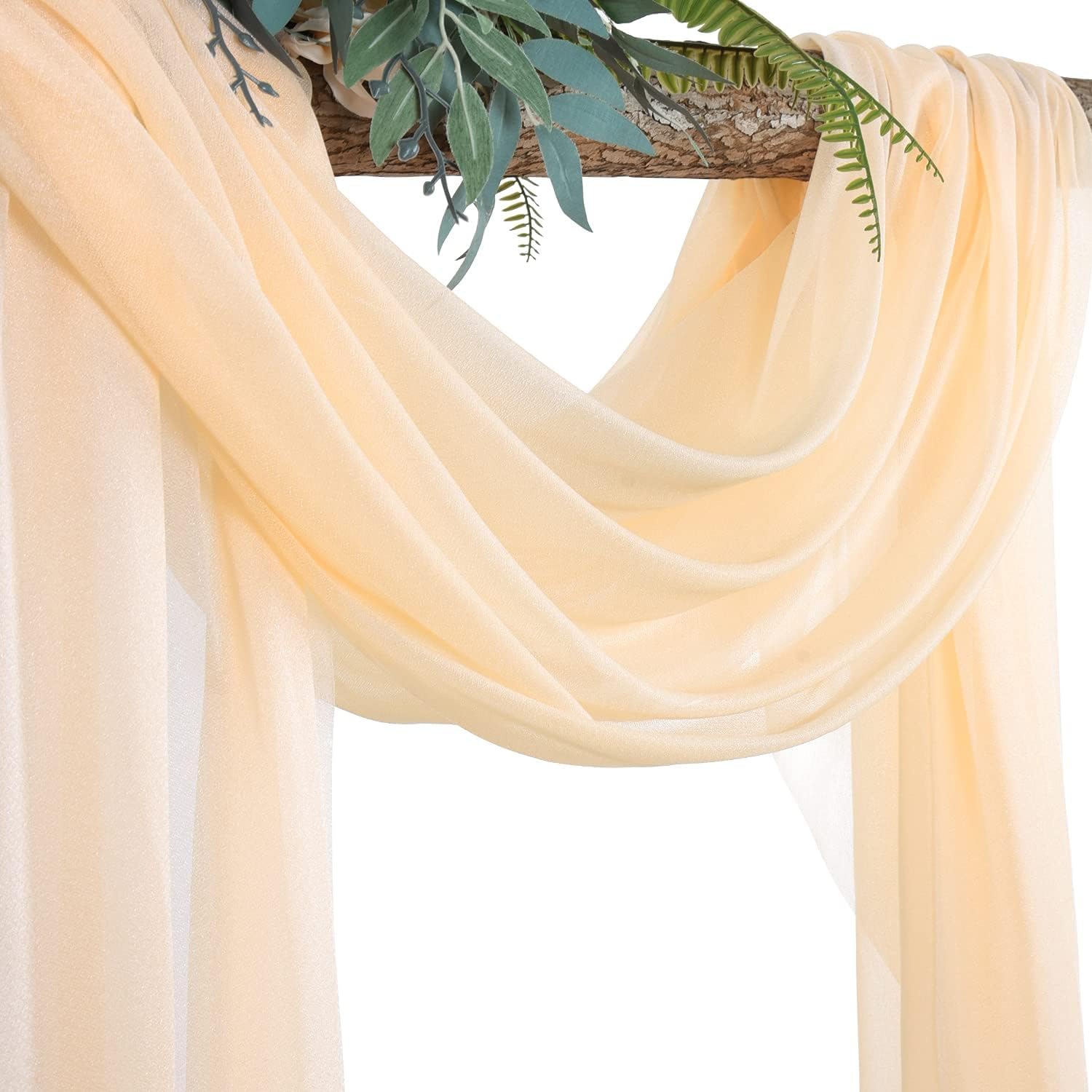 - Sheer Backdrop Curtain Fabric: 2-pack, each panel measures 28inch wide x 19ft long. Wedding arch draping fabric are made of unique champagne chiffon fabric with a slight sheen, 100% wrinkle-resistant polyester. They are silky soft and more elegant than tulle or nylon fabrics