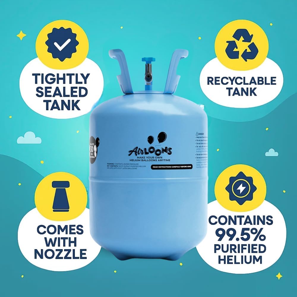 - Included Components : Helium Tank, 30 Multicolor 9 inch Latex Balloons, Spool of Curling Ribbon