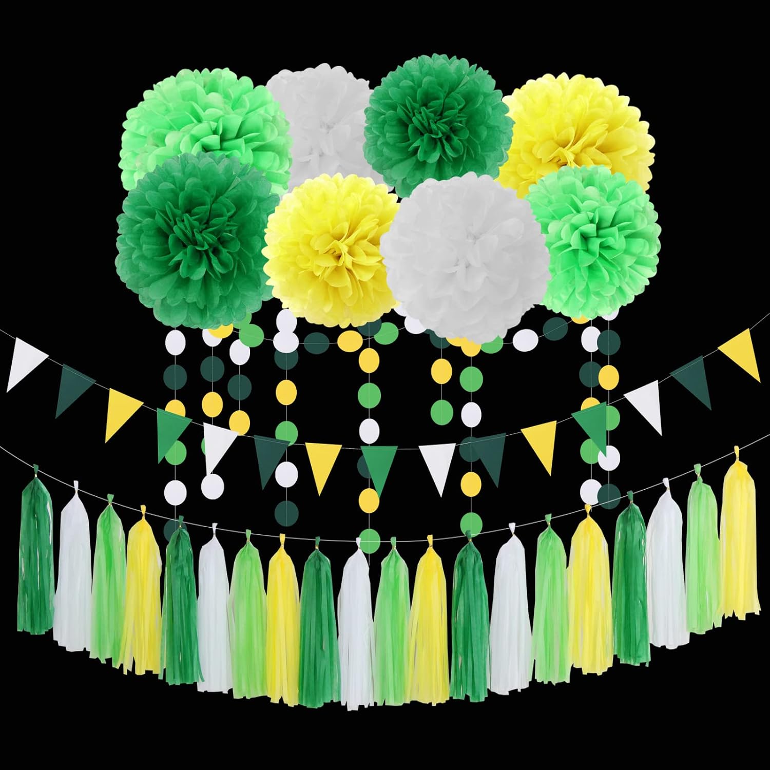 - 【Package Contains】The yellow green white party kits include 6pcs tissue paper flowers: 4pcs 8" and 4pcs 10" in four color, 1pcs Triangle Flags,1pcs circle dots paper garland,20pcs tassel garland. Total 30pcs.
