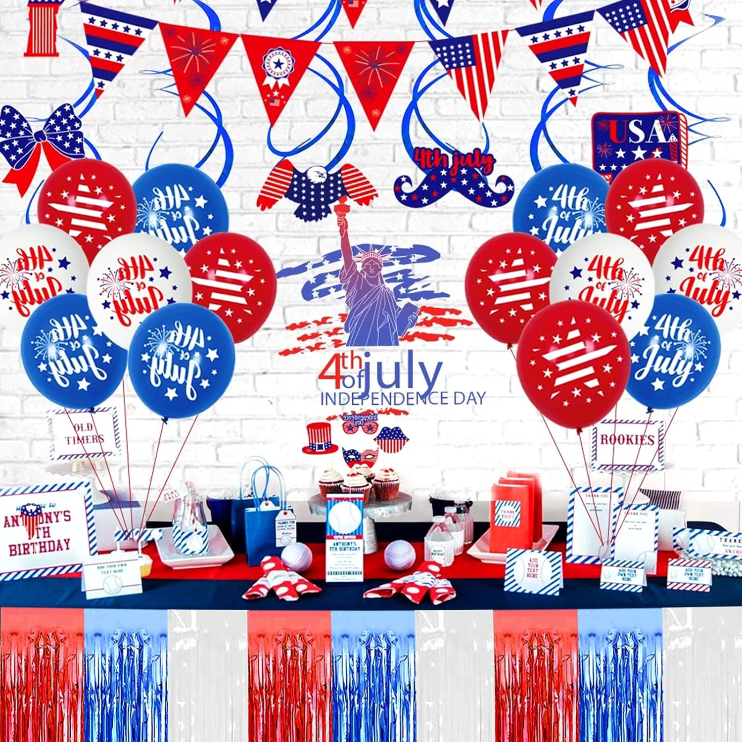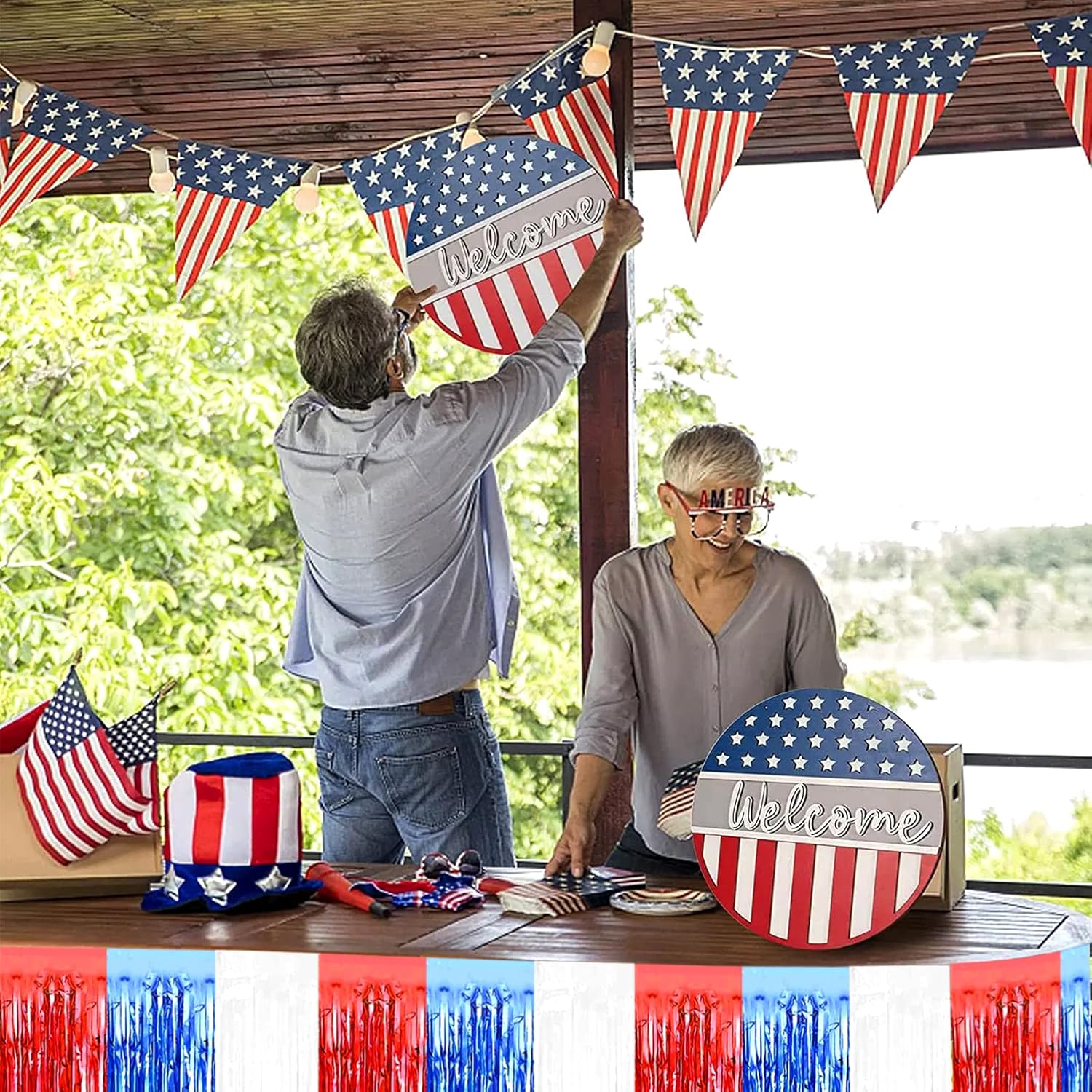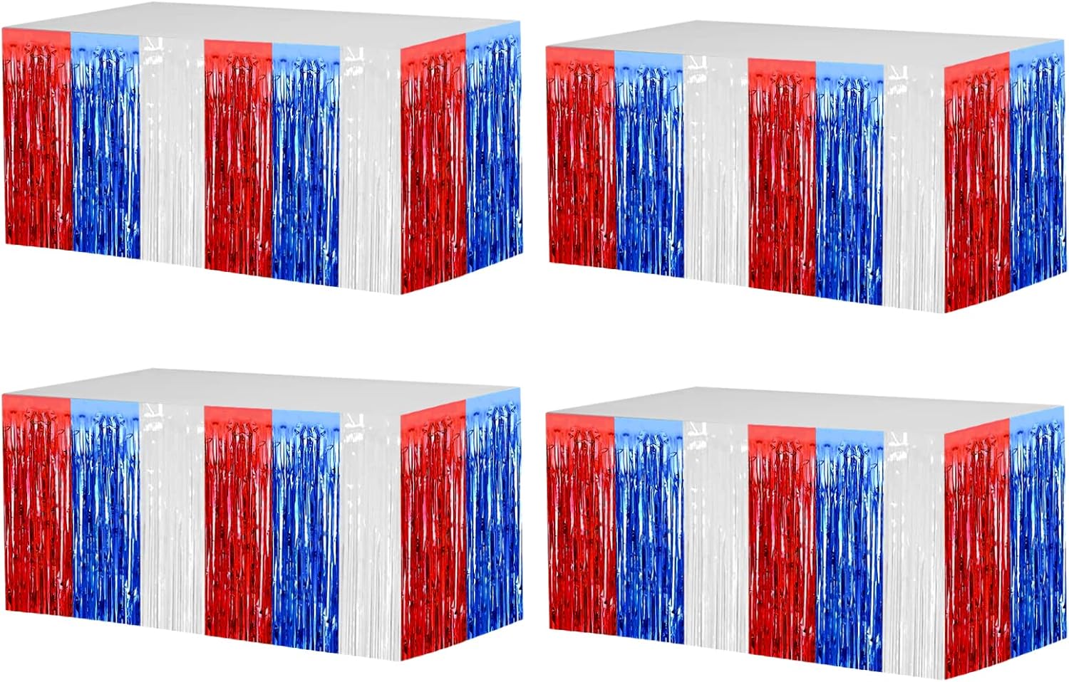4 Pack 29x108 Inch Metallic Foil Fringe Tinsel Table Skirts for Rectangle Tables Streamer Backdrop for Wedding, Birthday, Parade Floats, Christmas, Halloween Party Decoration(White Blue Red)