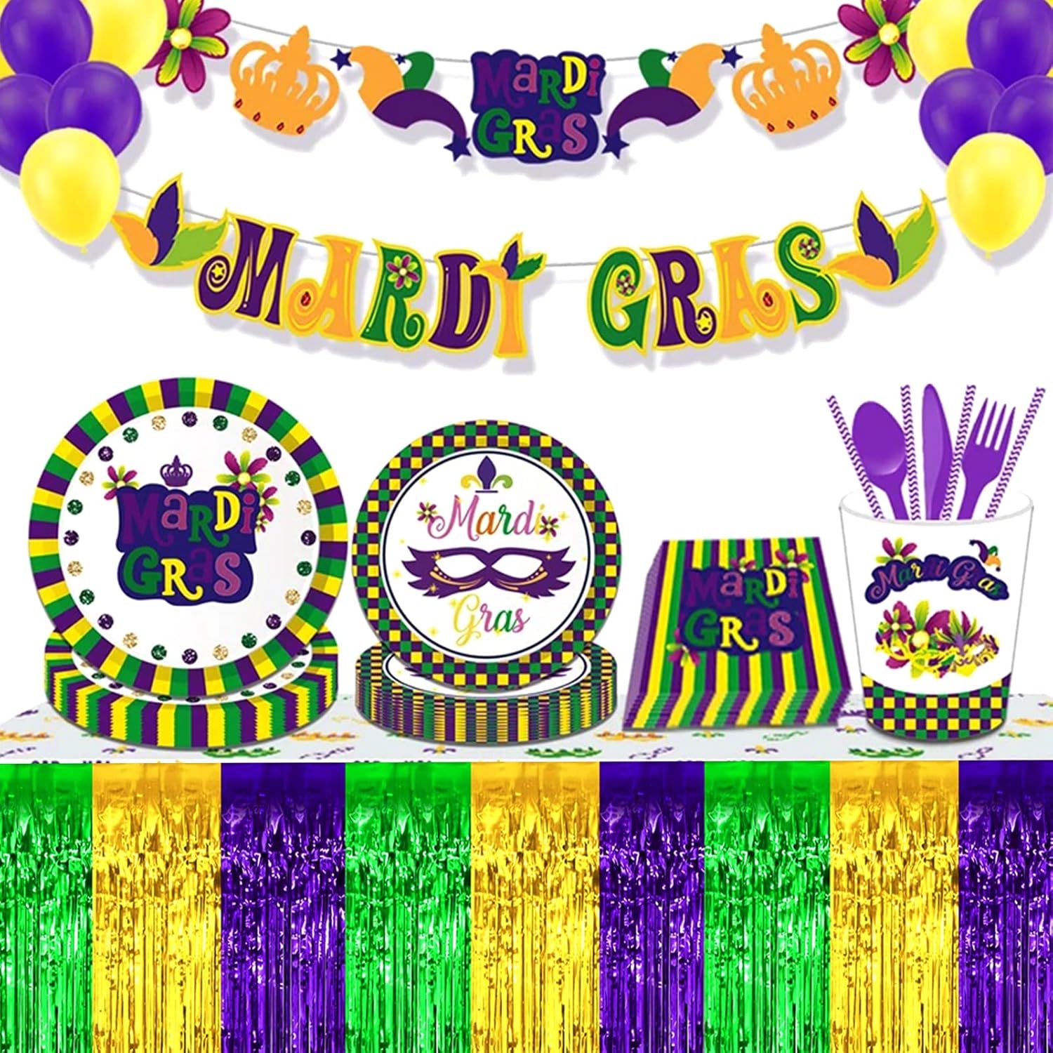 4 Pack 29x108 Inch Mardi Gras Metallic Foil Fringe Tinsel Table Skirts for Rectangle Tables Streamer Backdrop for Wedding, Birthday, Parade Floats, Valentine's Day Party Decoration(Gold Green Purple)