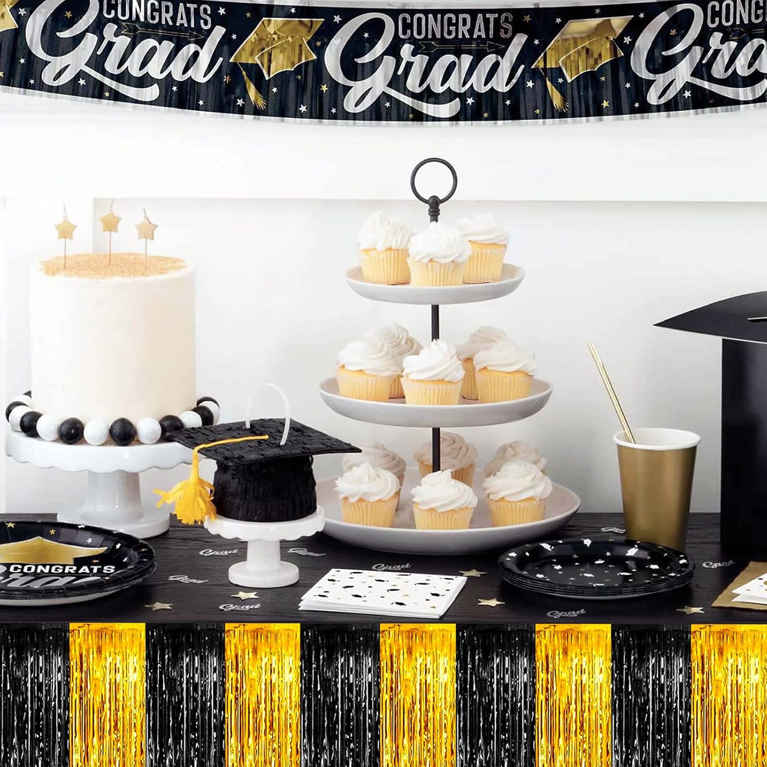4 Pack 29x108 Inch Metallic Foil Fringe Tinsel Table Skirts for Rectangle Tables Streamer Backdrop for Wedding, Birthday, Parade Floats, Christmas, Halloween Party Decoration(Black Gold)