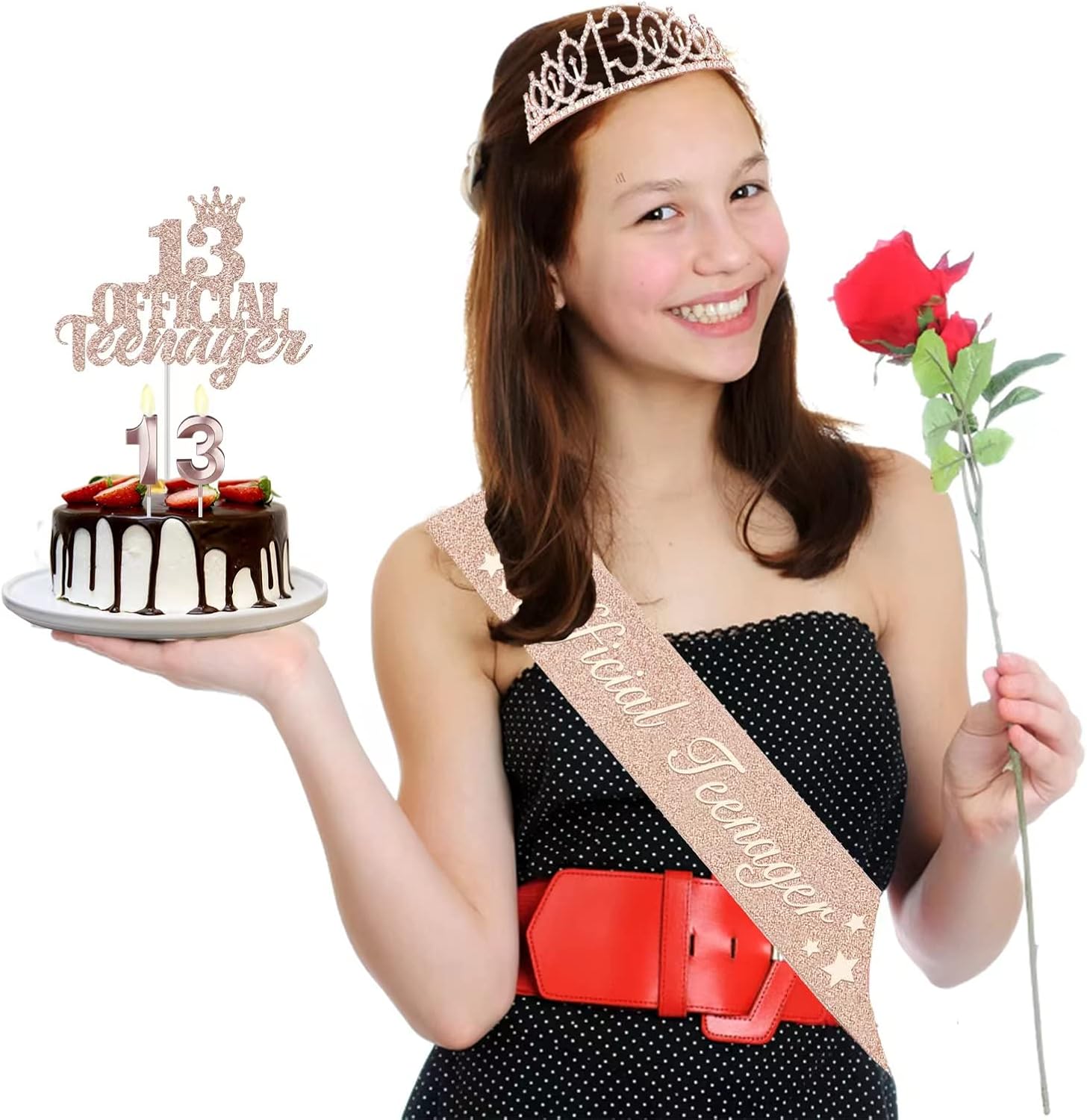 - 13 Official Teenager Birthday Decorations: Official Teenager 13 Birthday Sash for Girls x 1pc, Glittery 13th Birthday Tiara x 1pc, 13 Official Teenager Cake Topper x 1pc, Numeral 13th Birthday Candles x 1set. All be packed in a beautiful gift box ready for good presentation
