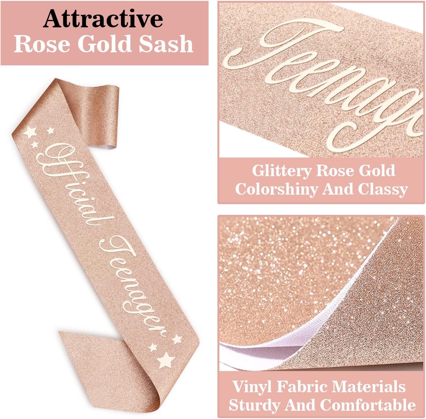 - 13th Birthday Sash for Girls: Our 13th birthday sash is made of high quality glitter fabirc with foil lettering "Official Teenager". The sash is in 63 inch length and comes with a gold charm pin that you can easily adjust the length you need