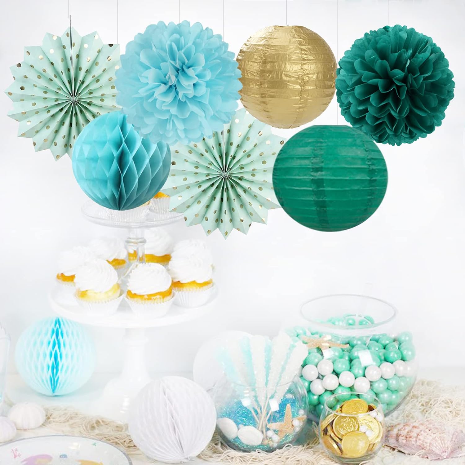 - 【Package Contains】The sage green teal blue gold party kits include 6pcs tissue paper flowers: 3pcs 10" and 3pcs 12" in three color, 4pcs 8inch paper honeycom ball,2pcs 8inch paper lantern, 2pcs 12inch paper fan.