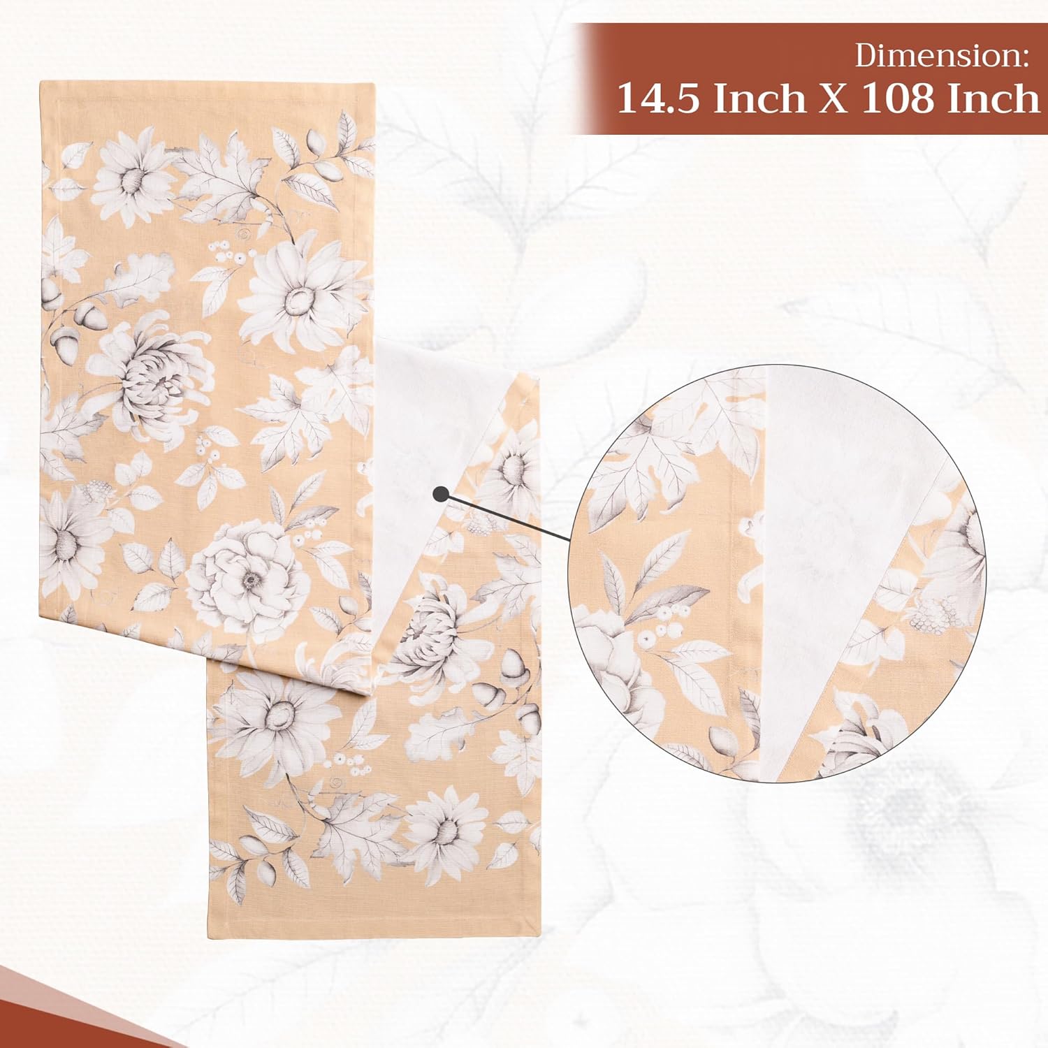 - Package Includes: 1 table runner measuring 14.5" x 108", made from 100% cotton. Ideal for banquet tables, dining tables, or adding a spring, Thanksgiving, or Christmas touch to your party decor. This 108-inch table runner brings unique charm to both casual and festive settings