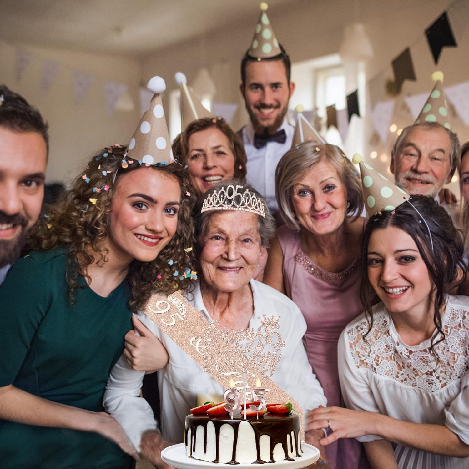 - 【95th Birthday Decorations】: 95th Birthday Sash for Women *1pc, Glittery 95 Birthday Crown *1pc, Happy 95th Birthday Cake Topper *1pc, 9+5 Numeral Candles *1set. All be packed in a beautiful gift box ready for good presentaion.