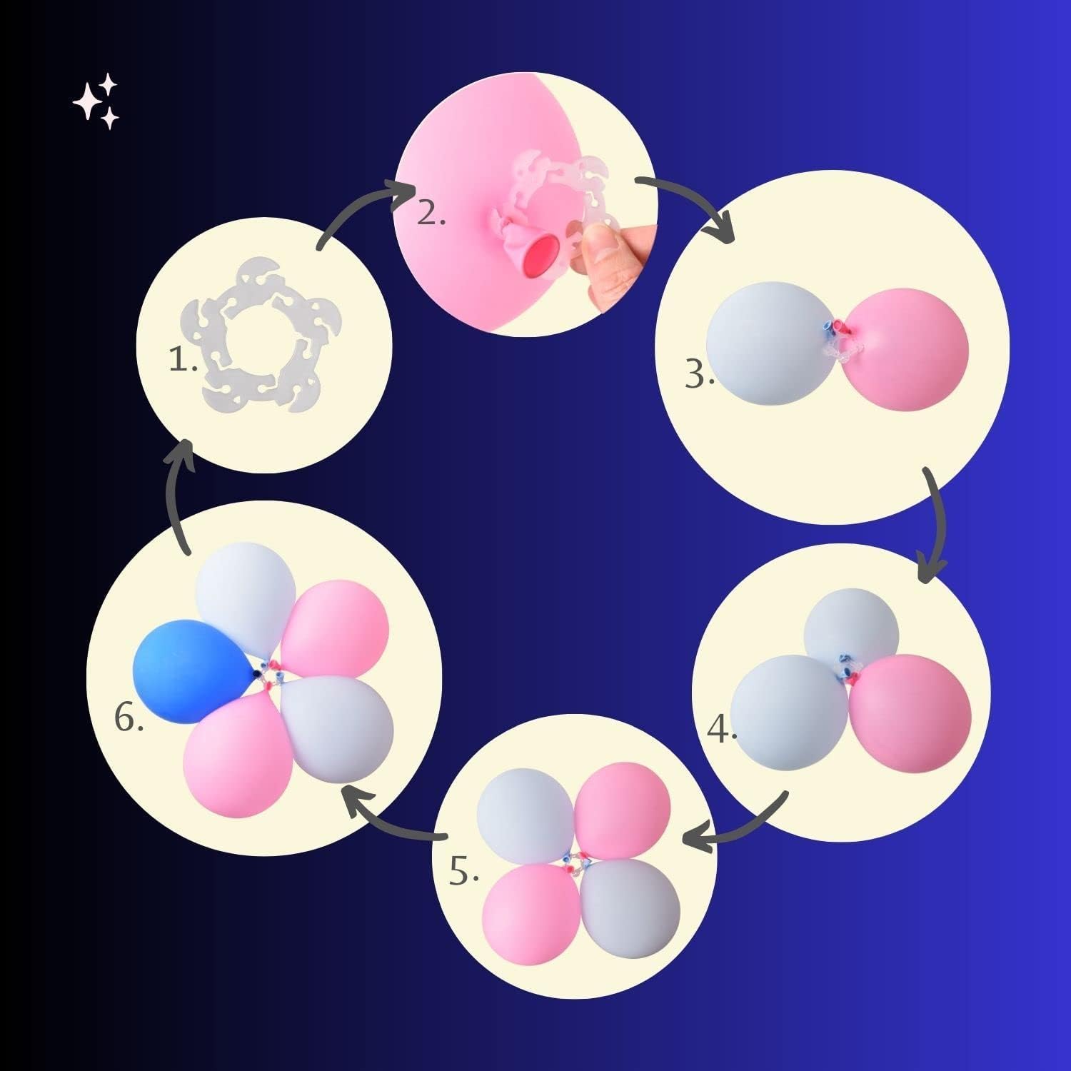 - 【Easy to Assemble Balloon Arch Ring Buckles】Each balloon accessories clips can fix 5 balloons, you just inflate your balloons and tie, then install the balloon over the clips and adjust the shape