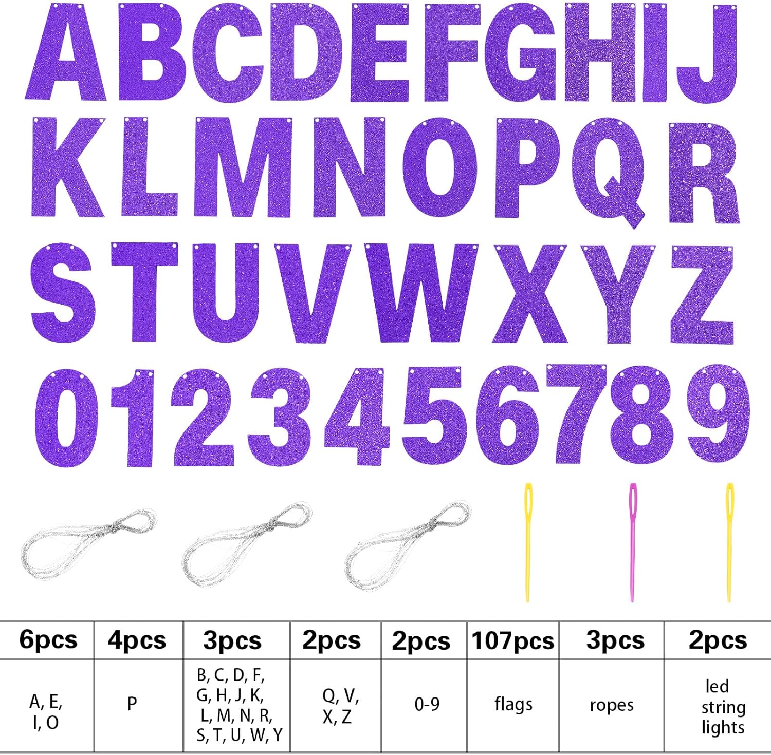 TaoBary 112 Pcs DIY Letter Custom Banner Glitter Customizable Banner Kit Including 107 Letters and Numbers 3 Rope for Valentine Birthday Party(Purple)