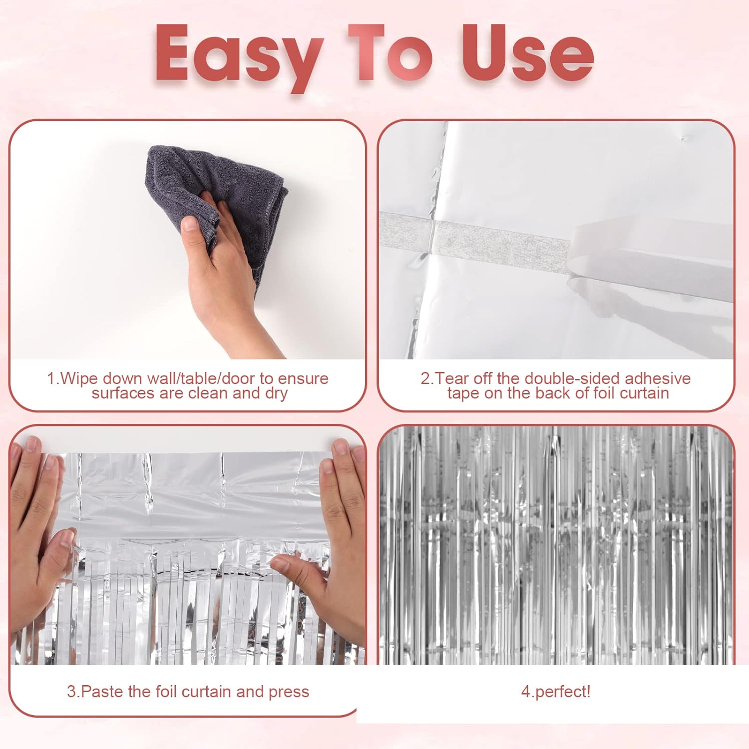 - Package Included: 4 packs of foil fringe curtains, the size of the foil curtain is 3.3*8.2 ft. It's long enough to fit any occasion. Please do not stick the foil curtain on uneven or stained walls to prevent it from falling off