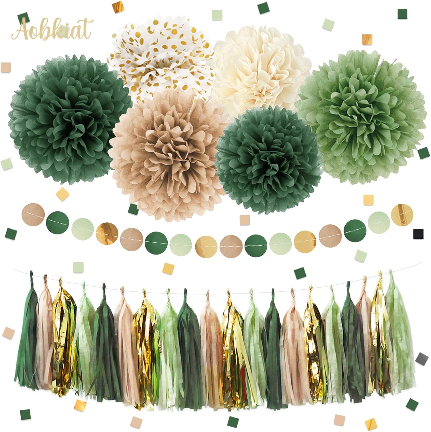 - Natural Colors : Emerald green, ivory and brown will create a vintage and romantic party atmosphere, and you will find that the pompoms will turn the party into a luxurious venue with the dot paper garland and tassel garland