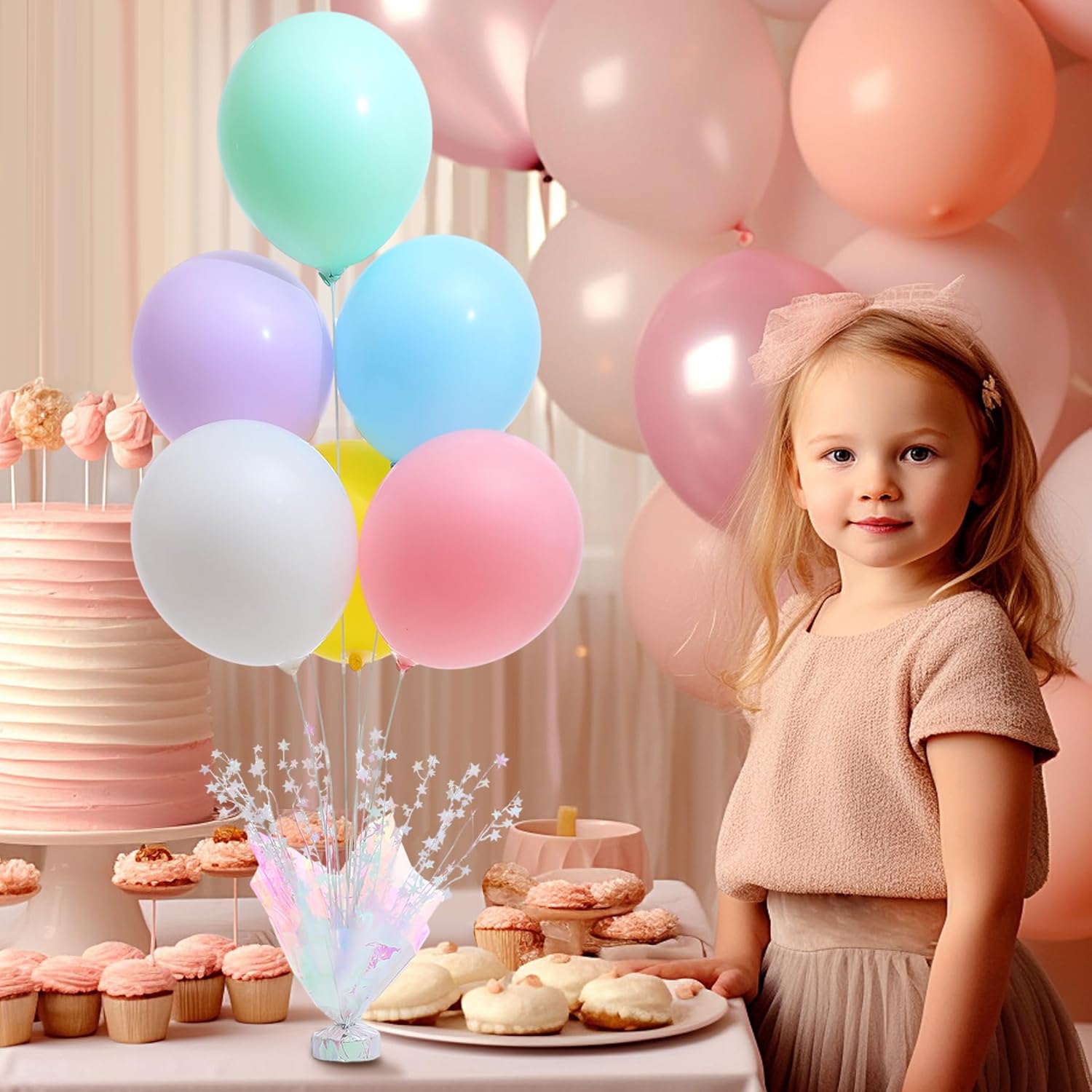 - Rainbow Balloon Centerpiece Kit Includes: 2 reusable pastel rainbow balloon stands for table (including 2 pastel foil star spray bases, 6 sticks, 6 stick connectors, and 12 cups) and 12 12-inch latex balloons, providing everything you need to create stunning table centerpieces
