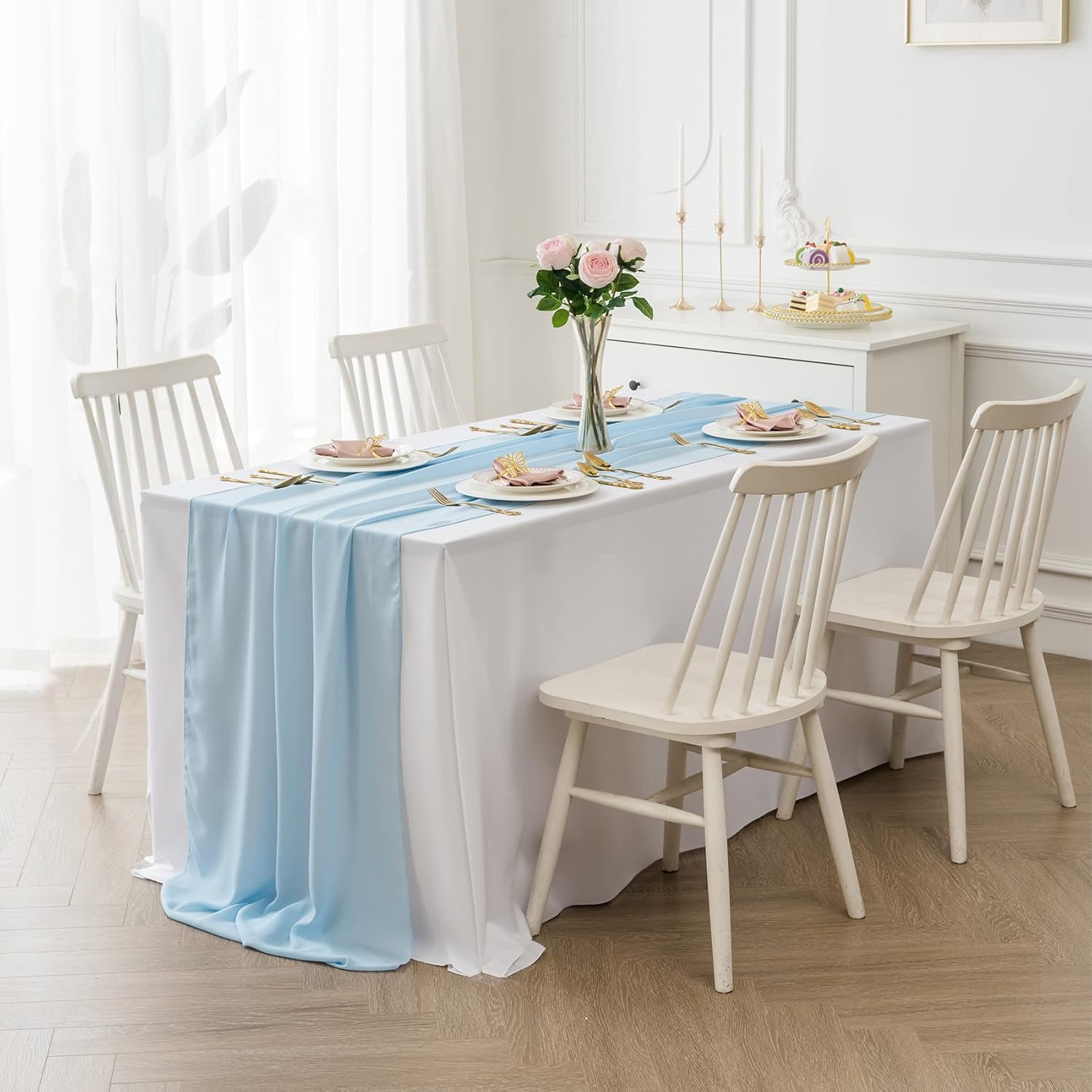 - Style:This colorful chiffon table runner has a flowy and elegant look,tie this romantic white sheer table runner up to create beautiful folds or leave it flowing loose onto the floor,add a luxurious feel to your special events.