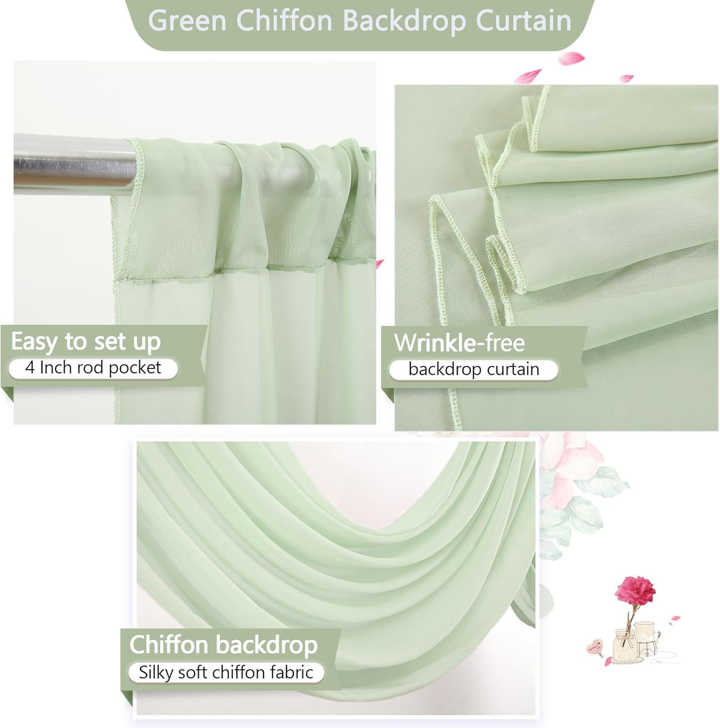 - Wrinkle-Free Fabric: The wedding curtain backdrop is made of 100% sheerness and thickness chiffon fabric, looked simple and elegant, touch silky soft and used sturdy. Chiffon fabric is easy to clean.Sage Green chiffon curtains allow seamless integration with any color scheme via decorations
