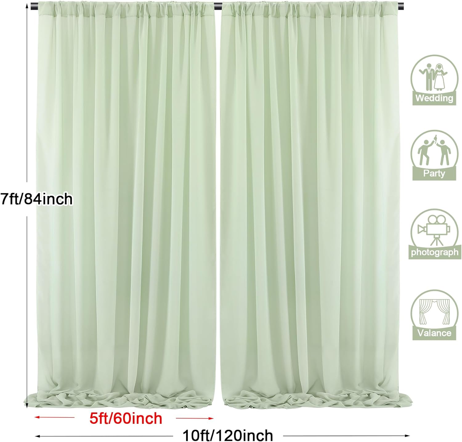 - 2 Panels Backdrop Drapes: Come with 2 panels Sage Green chiffon backdrop curtains,each panels size is 5ft width and 7ft height. Combined, entire backdrop curtains is 10ft*7ft. Please note: Not including the background stand