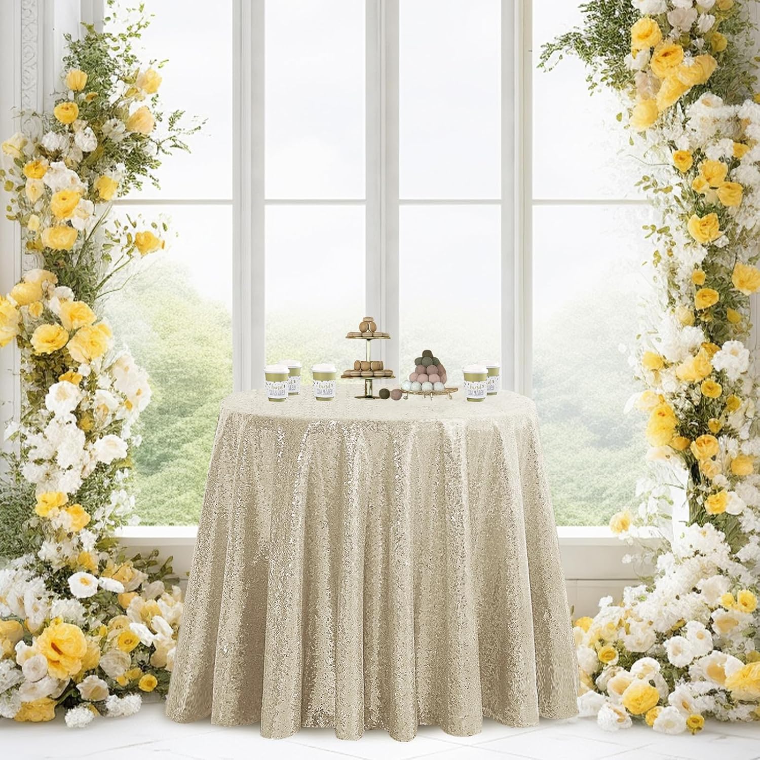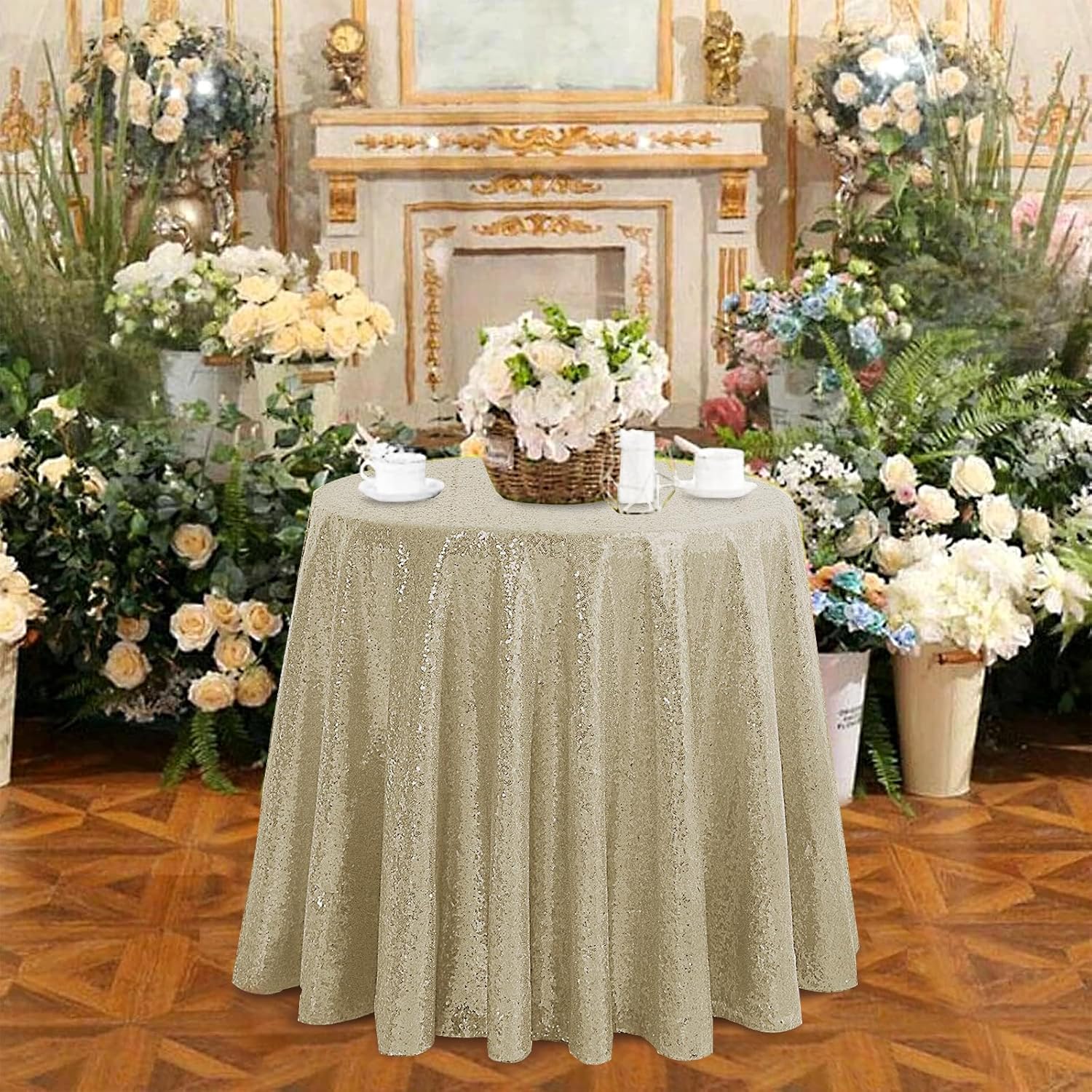 - Package Include: Your package will include 1 round champagne tablecloth measuring 50 W by 50 L inch. These sparkly table tablecloths are ideal for wedding, event table decorations for the reception.