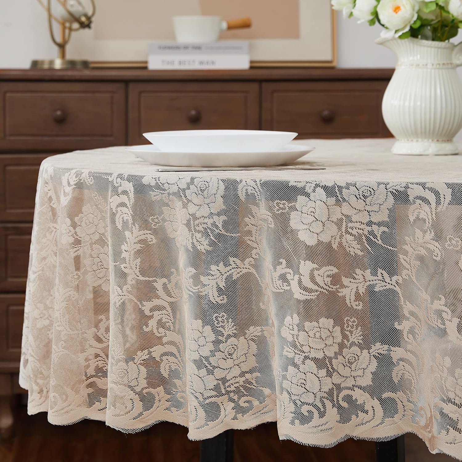 LinenZone Linen Round Tablecloth for Rustic Vintage Decor. Sheer Lace Works Great As Wedding, Thanksgiving or Christmas Tablecloth (Mia 48 Round, Linen)