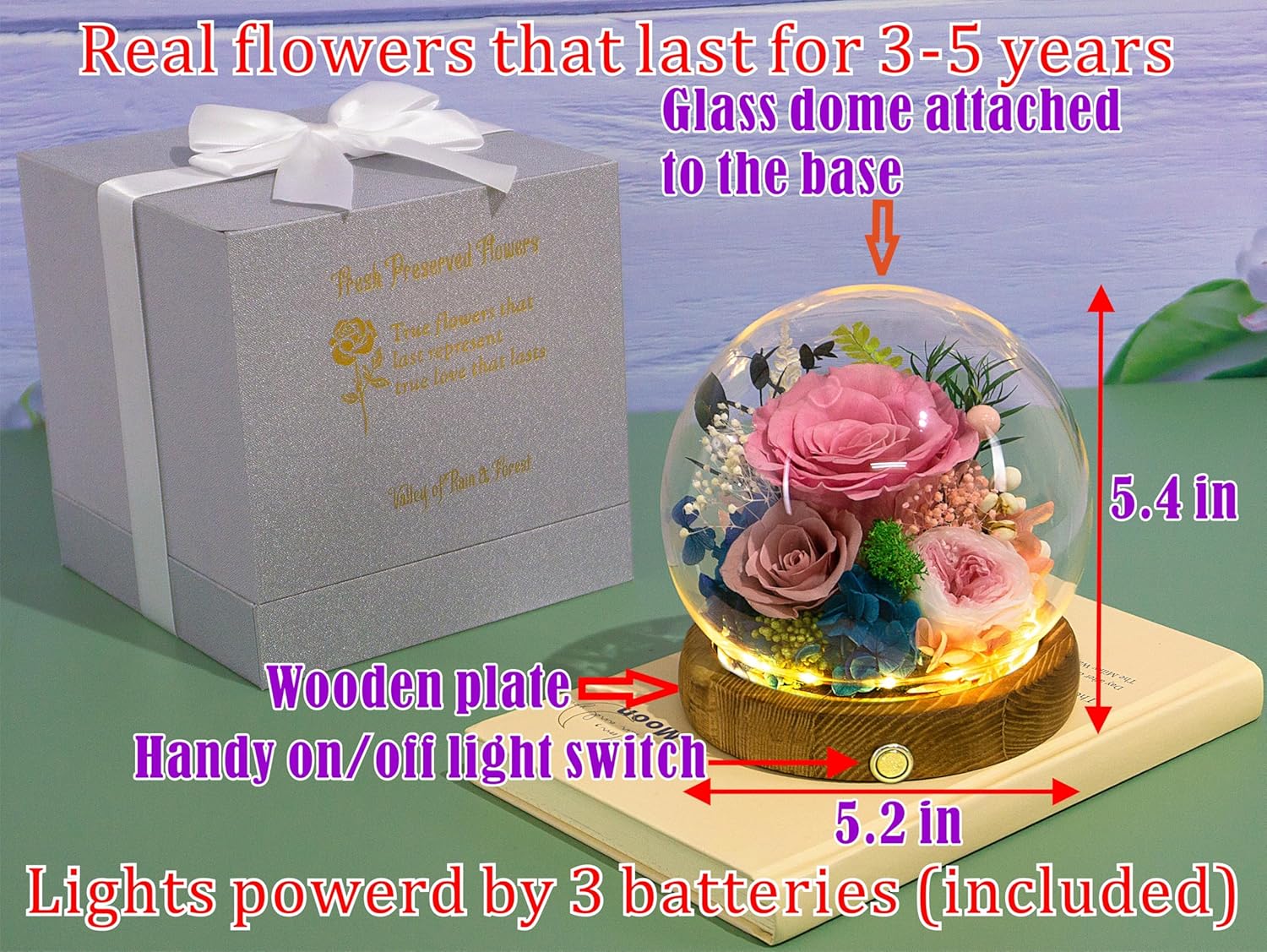 - ♥Please note♥:1. Due to the delicateness of natural flowers, opening the glass dome is not recommended as it can lead to unintended damage to the flowers. 2. Since these are real flowers crafted by hand and not mass-produced by machine, there may be slight variations in certain cases. 3. loose and incorrect battery insert will result in lights not turning on. If that's the case, simply remove the batteries and reinsert them correctly. 4. We've recently made new improvements to our products for you. For more details, simply go to the bottom of this page.