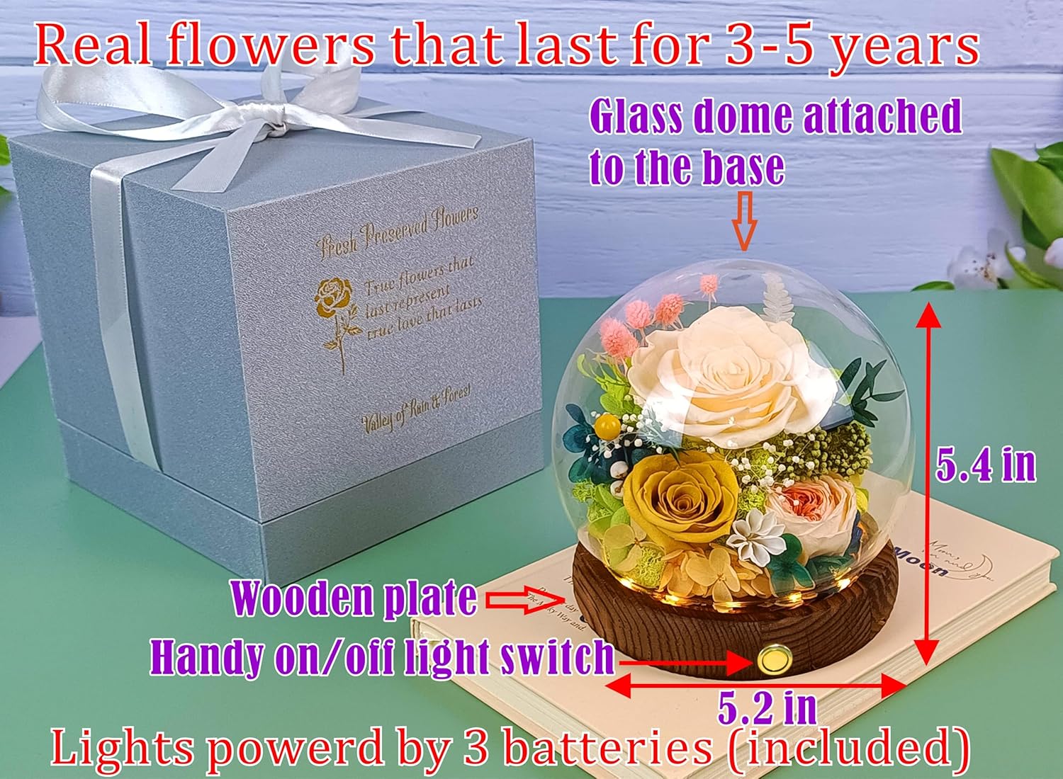- 【Please note】:1. Due to the delicateness of natural flowers, opening the glass dome is not recommended as it can lead to unintended damage to the flowers. 2. Since these are real flowers crafted by hand and not mass-produced by machine, there may be slight variations in certain cases. 3. loose and incorrect battery insert will result in lights not turning on. If that's the case, simply remove the batteries and reinsert them correctly. 4. We've recently made new improvements to our products for you. For more details, simply go to the bottom of this page.